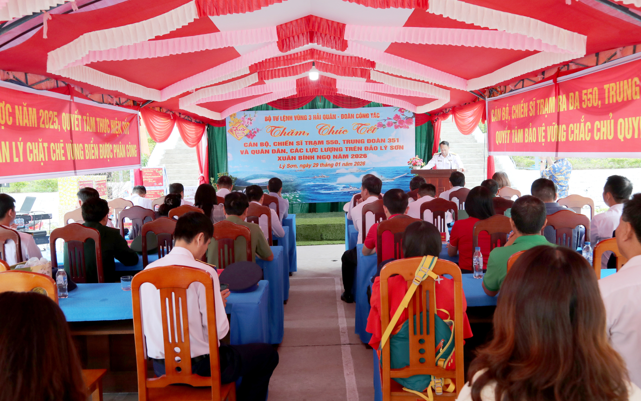 HQ Online - Nhân dịp chuẩn bị Tết Nguyên đán Bính Ngọ 2026, sáng 29/1, đoàn công tác Vùng 3 Hải quân và các địa phương, cơ quan, tổ chức, câu lạc bộ, doanh nghiệp đến thăm chúc Tết cán bộ, chiến sĩ Trạm ra đa 550, Trung đoàn 351, Vùng 3 Hải quân và các lực lượng, chính quyền, nhân dân đặc khu Lý Sơn, tỉnh Quảng Ngãi.