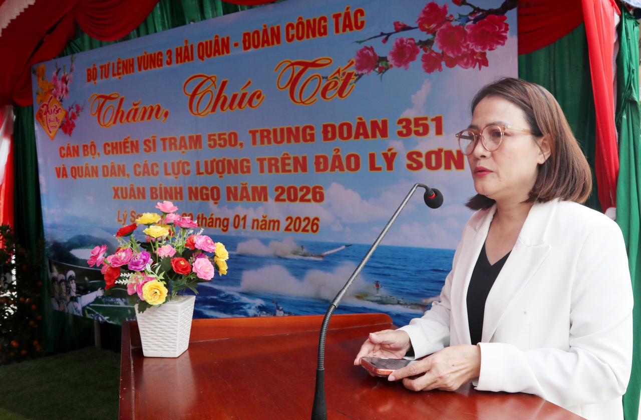 Thay mặt đoàn công tác, đồng chí Trần Thị Mẫn chúc Tết cán bộ, chiến sĩ, chính quyền địa phương, nhân dân đặc khu Lý Sơn và gia đình luôn luôn bình an, hạnh phúc và thành công
