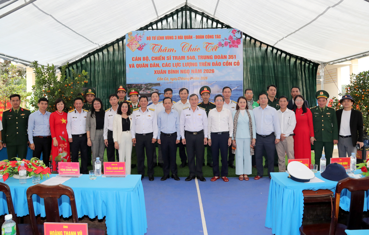HQ Online - Sáng 27/1, đoàn công tác Vùng 3 Hải quân do Chuẩn Đô đốc Nguyễn Đăng Tiến, Bí thư Đảng ủy, Chính ủy Vùng làm trưởng đoàn đã đến thăm, chúc Tết cán bộ, chiến sĩ Trạm ra đa 540, Trung đoàn 351, Vùng 3 Hải quân và các lực lượng, nhân dân đặc khu Cồn Cỏ (tỉnh Quảng Trị) nhân dịp Tết Nguyên đán Bính Ngọ 2026.