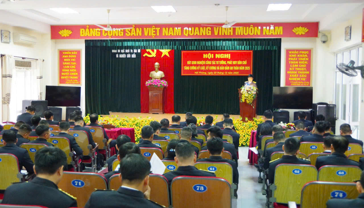 HQ Online - Chiều 29/12, tại Hải Phòng, Đoàn Đo đạc biên vẽ hải đồ và nghiên cứu biển, Bộ Tham mưu Hải quân tổ chức Hội nghị rút kinh nghiệm công tác tư tưởng, phát huy dân chủ, tăng cường kỷ luật, kỷ cương và bảo đảm an toàn năm 2025. Đại tá Lê Sĩ Toản, Bí thư Đảng ủy, Chính ủy Đoàn chủ trì.