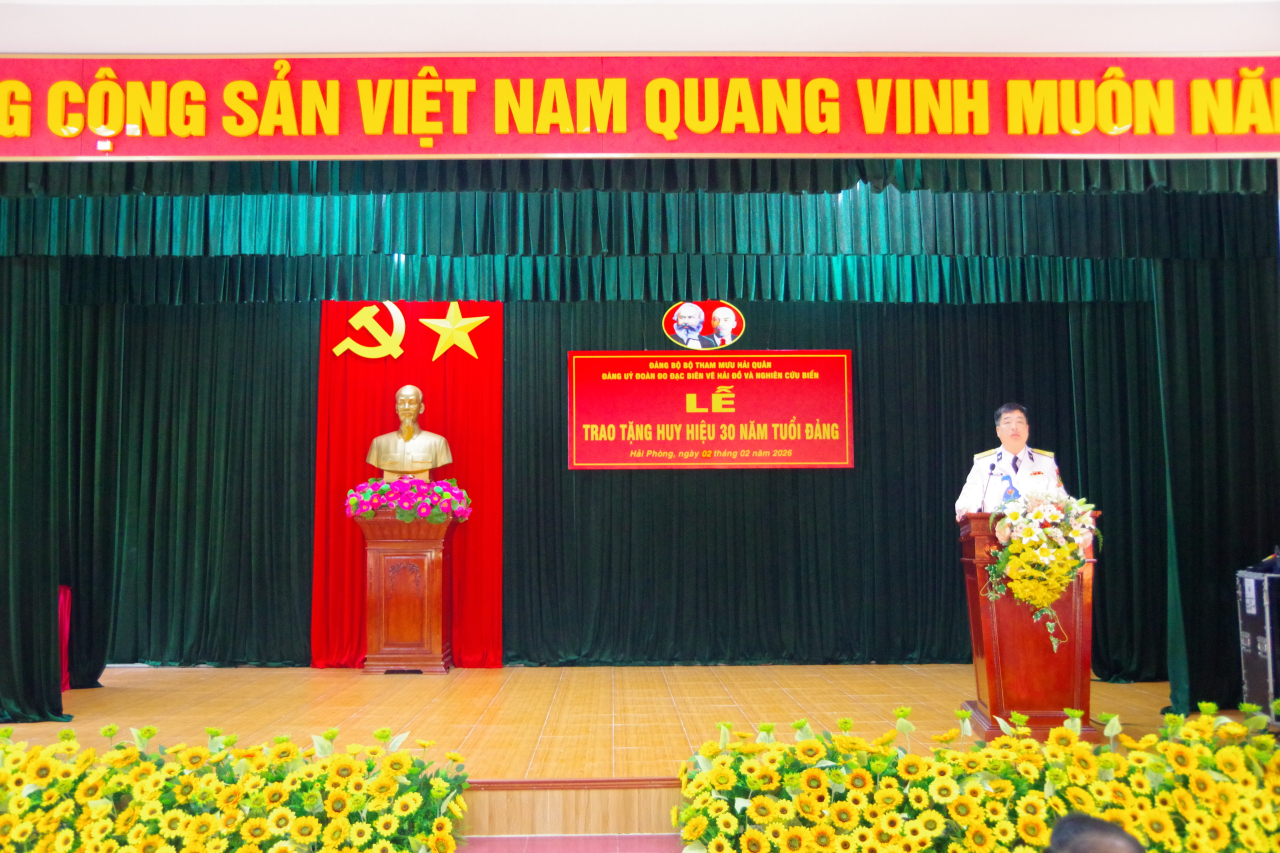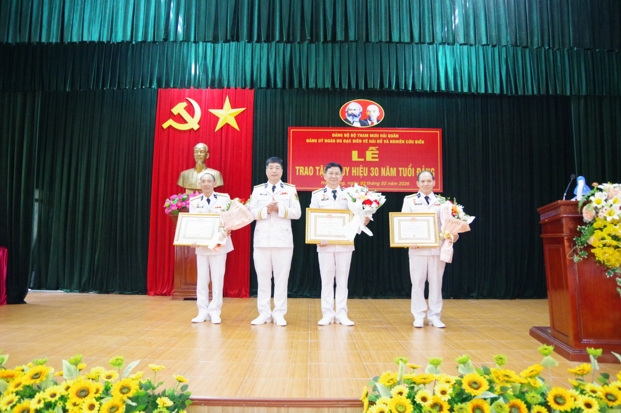 HQ Online - Chiều 2/2, tại Hải Phòng, Đảng ủy Đoàn Đo đạc biên vẽ hải đồ và nghiên cứu biển tổ chức Lễ trao Huy hiệu 30 năm tuổi Đảng cho Thượng tá Lê Xuân Hùng, Phó Chủ nhiệm Chính trị, đảng viên Chi bộ Phòng Chính trị; Trung tá QNCN Phạm Ngọc Bình và Trung tá QNCN Nguyễn Trung Kiên, đảng viên Đảng bộ bộ phận Phòng Hậu cần - Kỹ thuật.