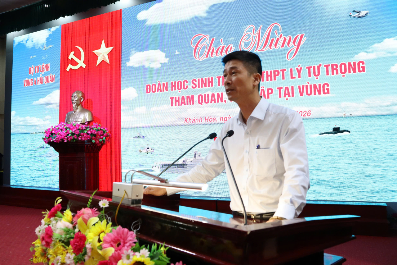 Phát biểu tại buổi làm việc, Đại tá Nguyễn Vĩnh Nam, Phó Tư lệnh Vùng 4 Hải quân bày tỏ vui mừng được đón tiếp đoàn giáo viên, học sinh Trường THPT Lý Tự Trọng đến tham quan, học tập tại đơn vị.