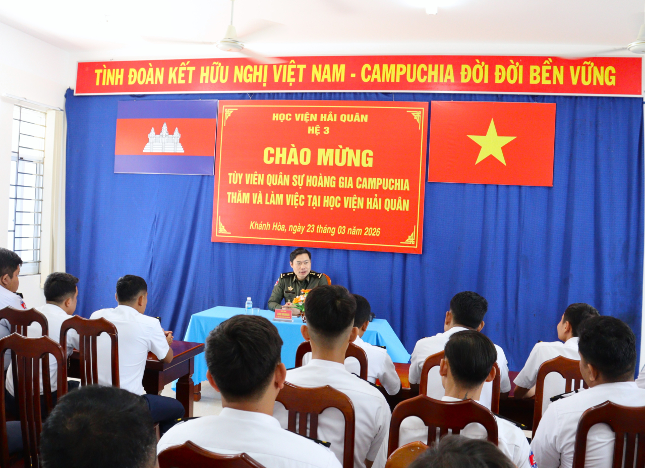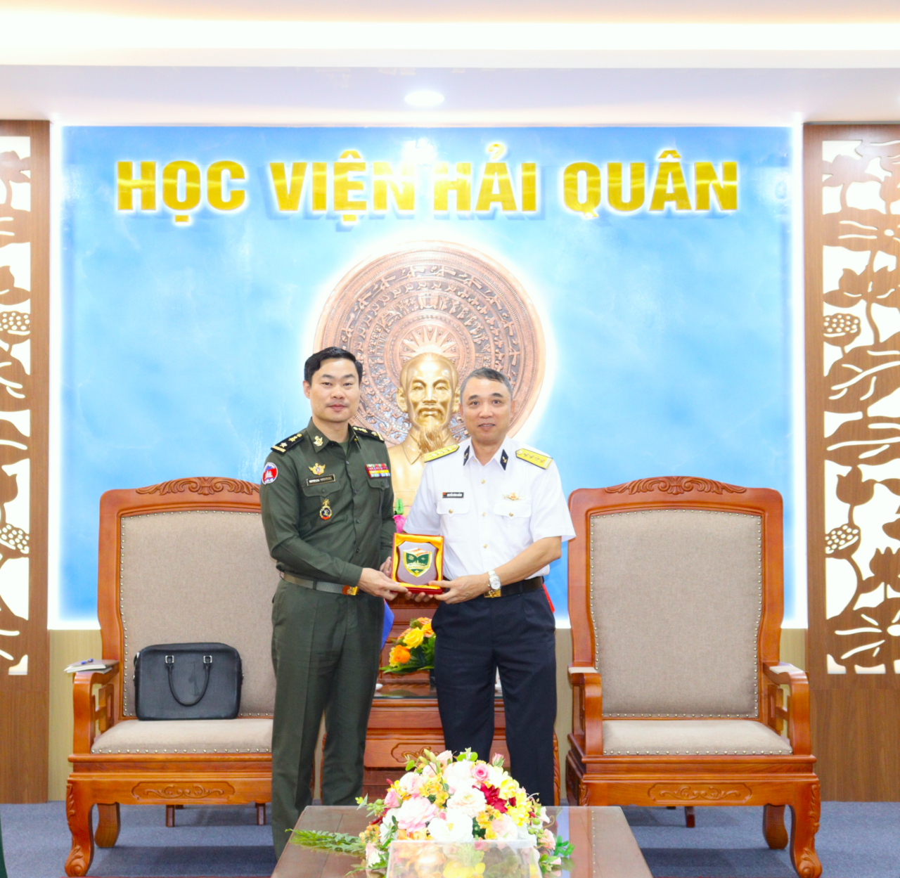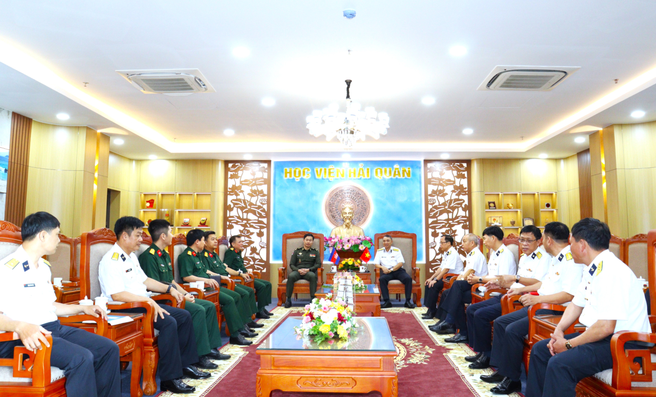 Thay mặt lãnh đạo, chỉ huy Học viện, Đại tá Nguyễn Đình Giảng chào mừng đoàn công tác đã đến thăm và làm việc tại Học viện Hải quân. Trong chương trình làm việc, hai bên đã trao đổi về công tác giáo dục và đào tạo, những kết quả đạt được và hướng tới tiếp tục đẩy mạnh hợp tác đào tạo, gắn kết quan hệ hữu nghị truyền thống giữa hải quân, quân đội hai nước Việt Nam và Campuchia.