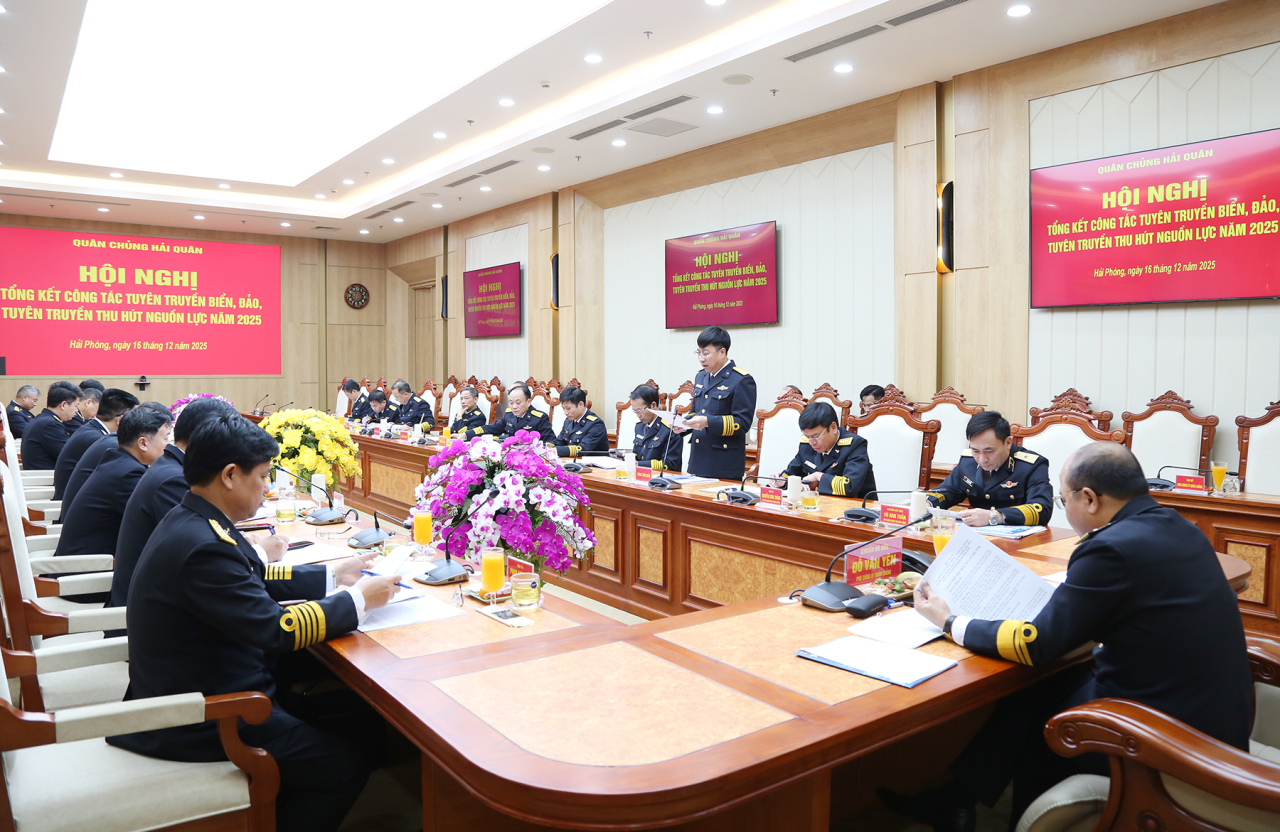 Sáng 16/12, tại Hải Phòng, Quân chủng Hải quân tổ chức Hội nghị tổng kết công tác tuyên truyền biển, đảo (TTBĐ) và thu hút nguồn lực (THNL) năm 2025. Chuẩn Đô đốc Đỗ Văn Yên, Phó Chính ủy Hải quân chủ trì hội nghị.