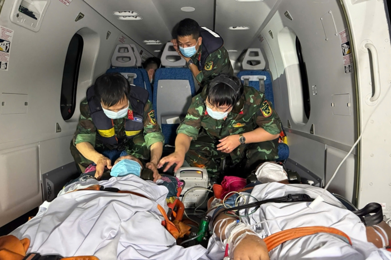 Bác sĩ theo dõi, chăm sóc các bệnh nhân trên trực thăng trong quá trình vận chuyển