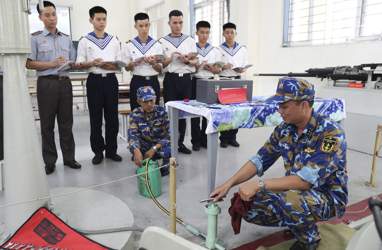 Đến dự một buổi học thực hành tra dầu thủy lực cho pháo AK-630M trên tàu tên lửa 12418 của học viên, chúng tôi thấy được hiệu quả của chiếc bơm tay tra dầu thủy lực. Đây là sáng kiến của Trung tá quân nhân chuyên nghiệp Trần Quốc Phương, Giảng viên Khoa Vũ khí. Buổi học thật sự thu hút các học viên khi bước vào thực hành tra dầu cho pháo, được xoay vòng đổi tập nên ai cũng háo hức được đến lượt mình thao tác.