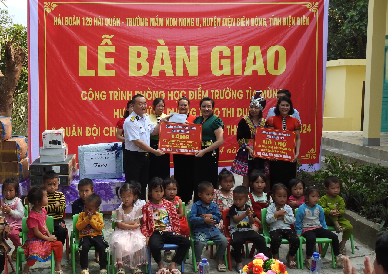 Đại tá Hoàng Đình Tuấn, Hải đoàn trưởng Hải đoàn 128 trao tặng vật tư hỗ trợ trường học tại tỉnh Điện Biên. Ảnh: Ngô Kỳ