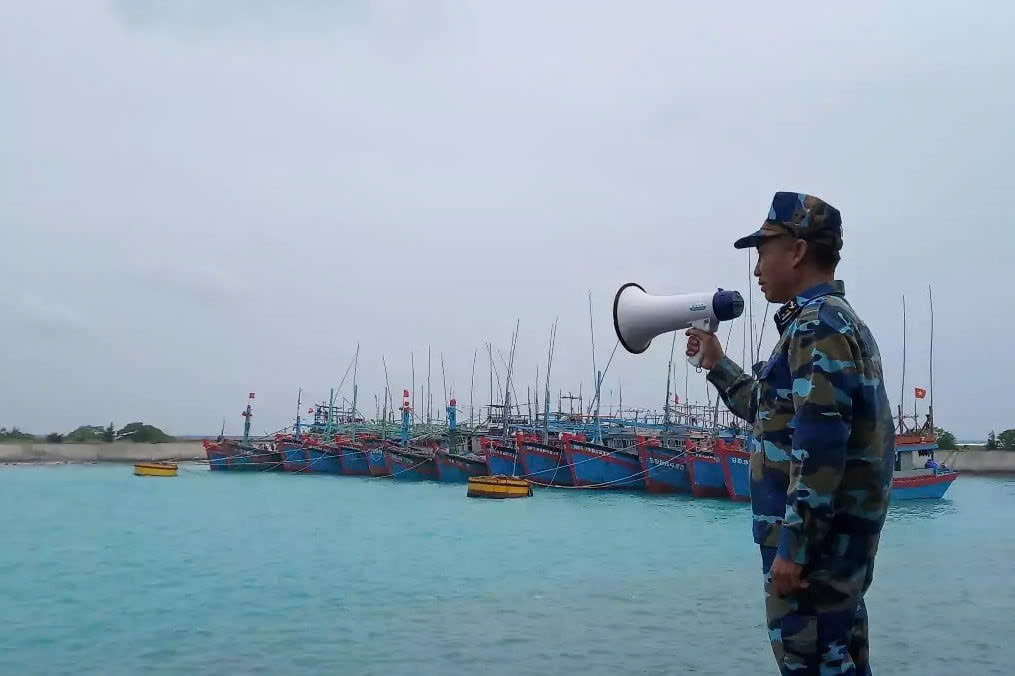 Nhân viên Âu tàu Song Tử Tây (Hải đoàn 128) hướng dẫn tàu cá vào âu tàu tránh bão. Ảnh: Ngô Kỳ