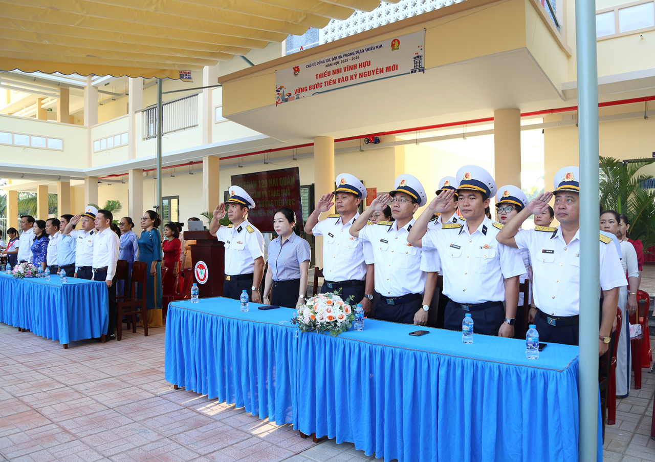 HQ Online - Sáng 8/12, đoàn công tác của Hải đoàn 129 Hải quân do Thượng tá Bùi Ngọc Sang, Chính ủy Hải đoàn làm trưởng đoàn đã đến dự Lễ chào cờ đầu tuần và thăm, tặng quà học sinh nghèo vượt khó tại Trường Tiểu học Nguyễn Thị Tốt, xã Vĩnh Hựu, tỉnh Đồng Tháp. Cùng tham dự có đồng chí Phạm Thế Vinh, Phó trưởng ban Tuyên giáo và Dân vận Tỉnh ủy Đồng Tháp, lãnh đạo chính quyền địa phương và tập thể cán bộ, giáo viên nhà trường.