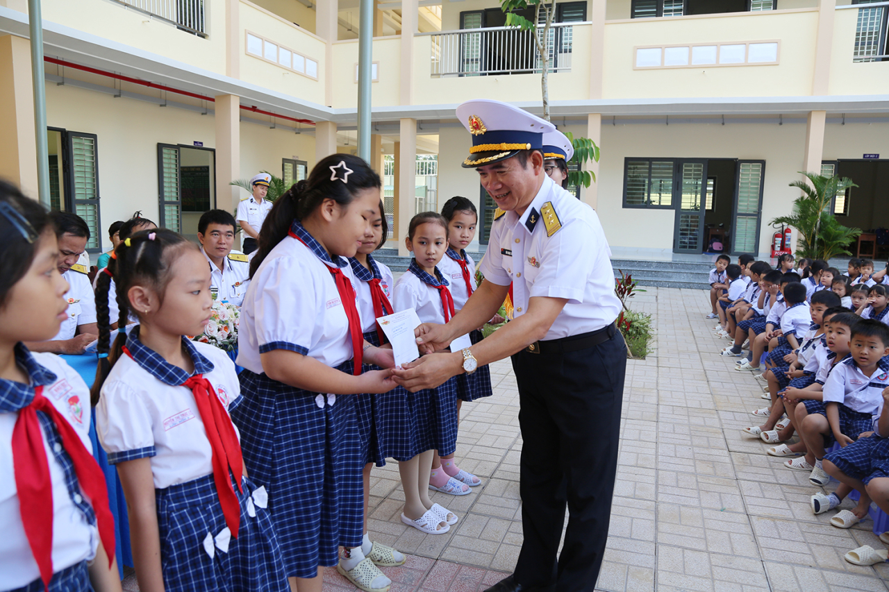 Thừa ủy quyền Đại tướng Nguyễn Trọng Nghĩa, chỉ huy Hải đoàn 129 trao quà cho đại diện trường