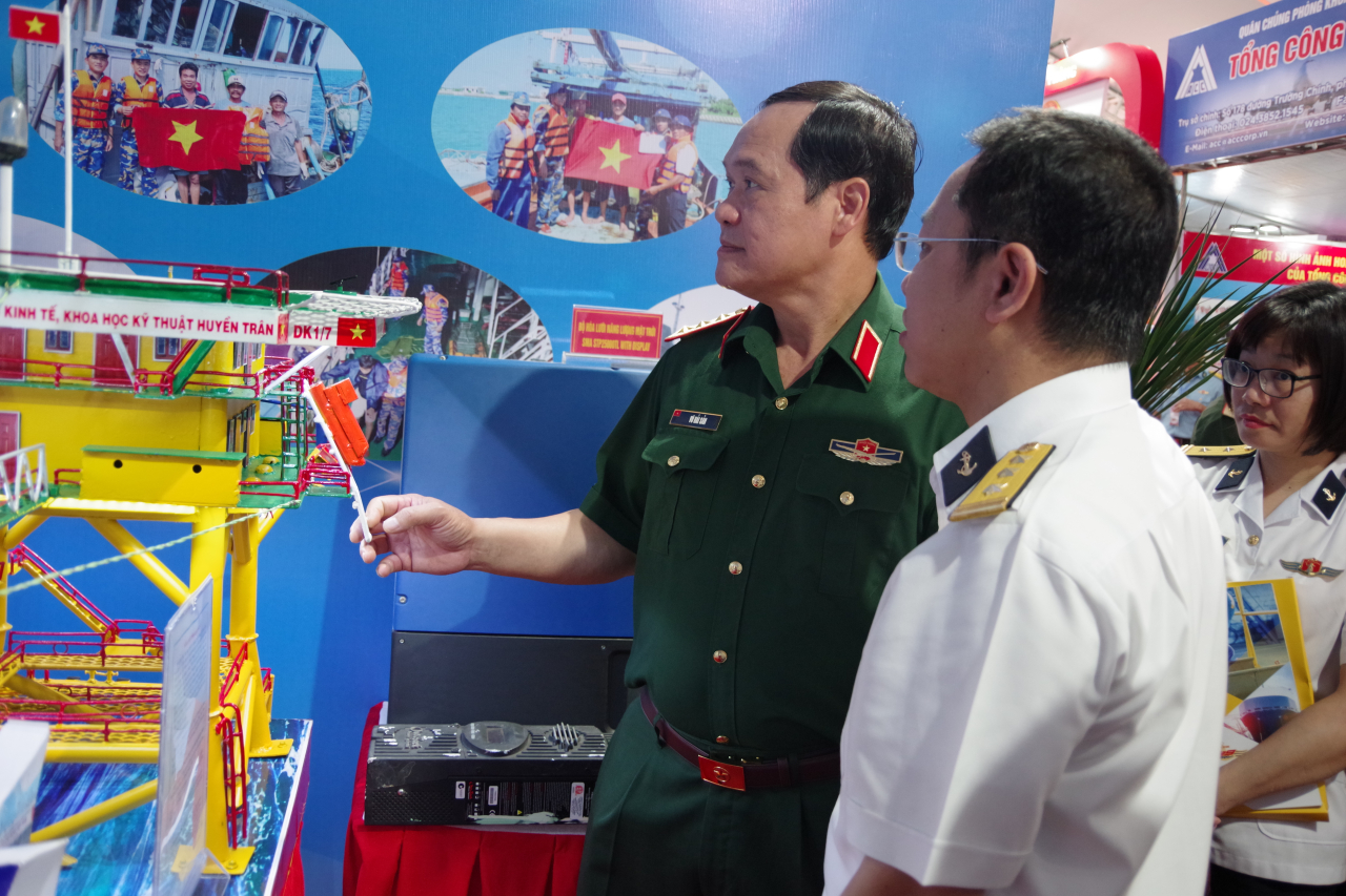 Thượng tướng Vũ Hải Sản, Ủy viên Trung ương Đảng, Thứ trưởng Bộ Quốc phòng tham quan gian trưng bày của Hải đoàn 129 tại Hội nghị doanh nghiệp Quân đội năm 2025