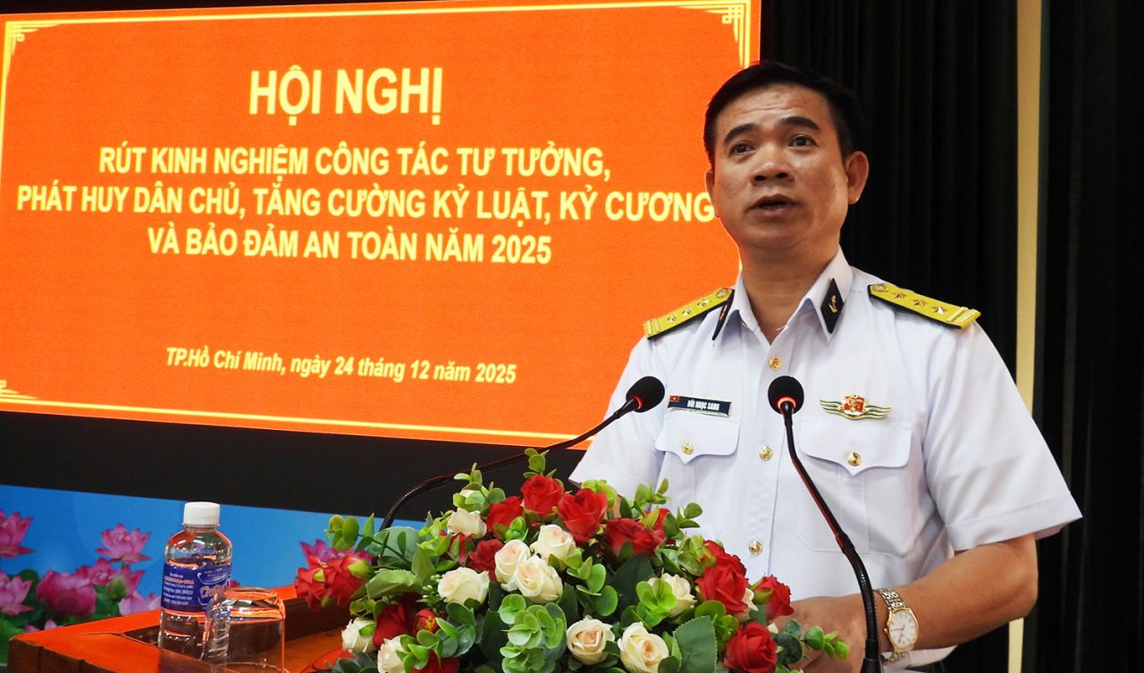HQ Online - Chiều 24/12, tại P. Phước Thắng (TP Hồ Chí Minh), Hải đoàn 129 Hải quân tổ chức Hội nghị rút kinh nghiệm công tác tư tưởng, phát huy dân chủ, tăng cường kỷ luật, kỷ cương và bảo đảm an toàn năm 2025. Thượng tá Bùi Ngọc Sang, Bí thư Đảng ủy, Chính ủy Hải đoàn chủ trì. Cùng dự có Đại tá Bùi Quang Tú, Phó Bí thư Đảng ủy, Hải đoàn trưởng.