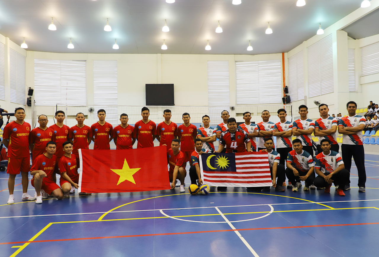 Hải quân Việt Nam và Hải quân Malaysia chụp ảnh lưu niệm trước khi giao lưu bóng chuyền