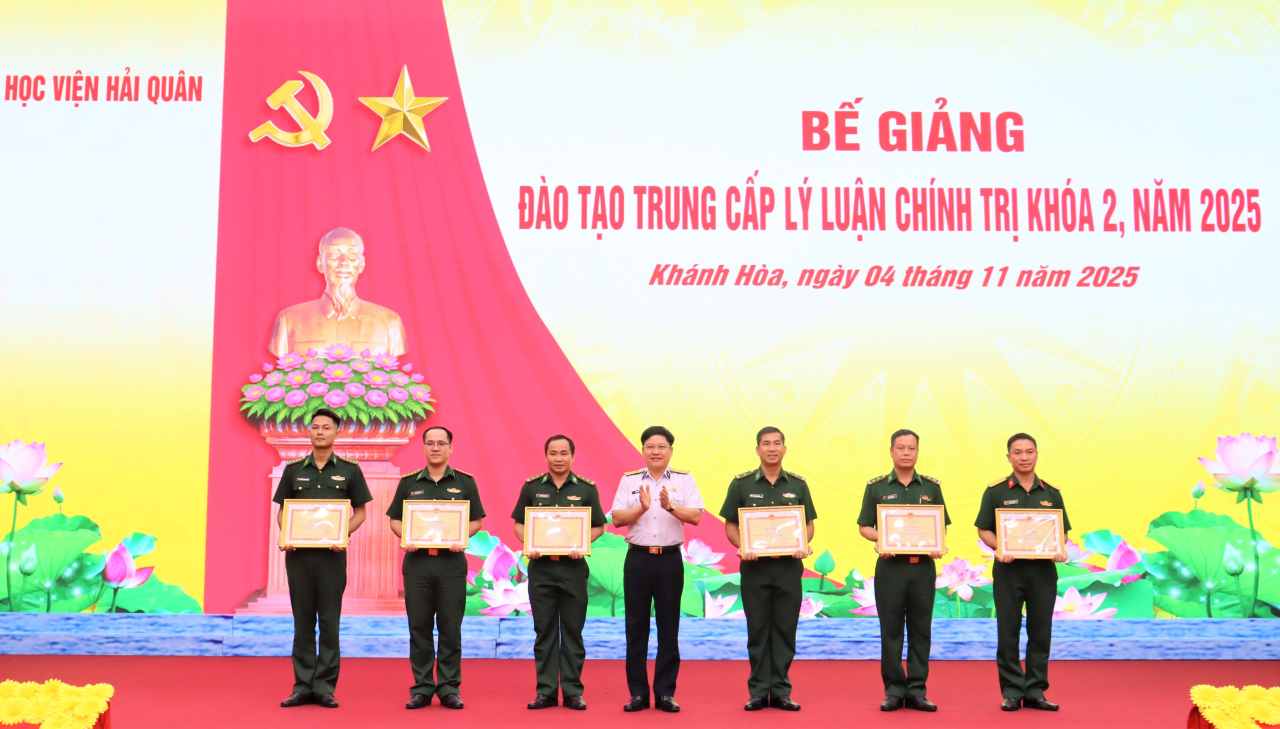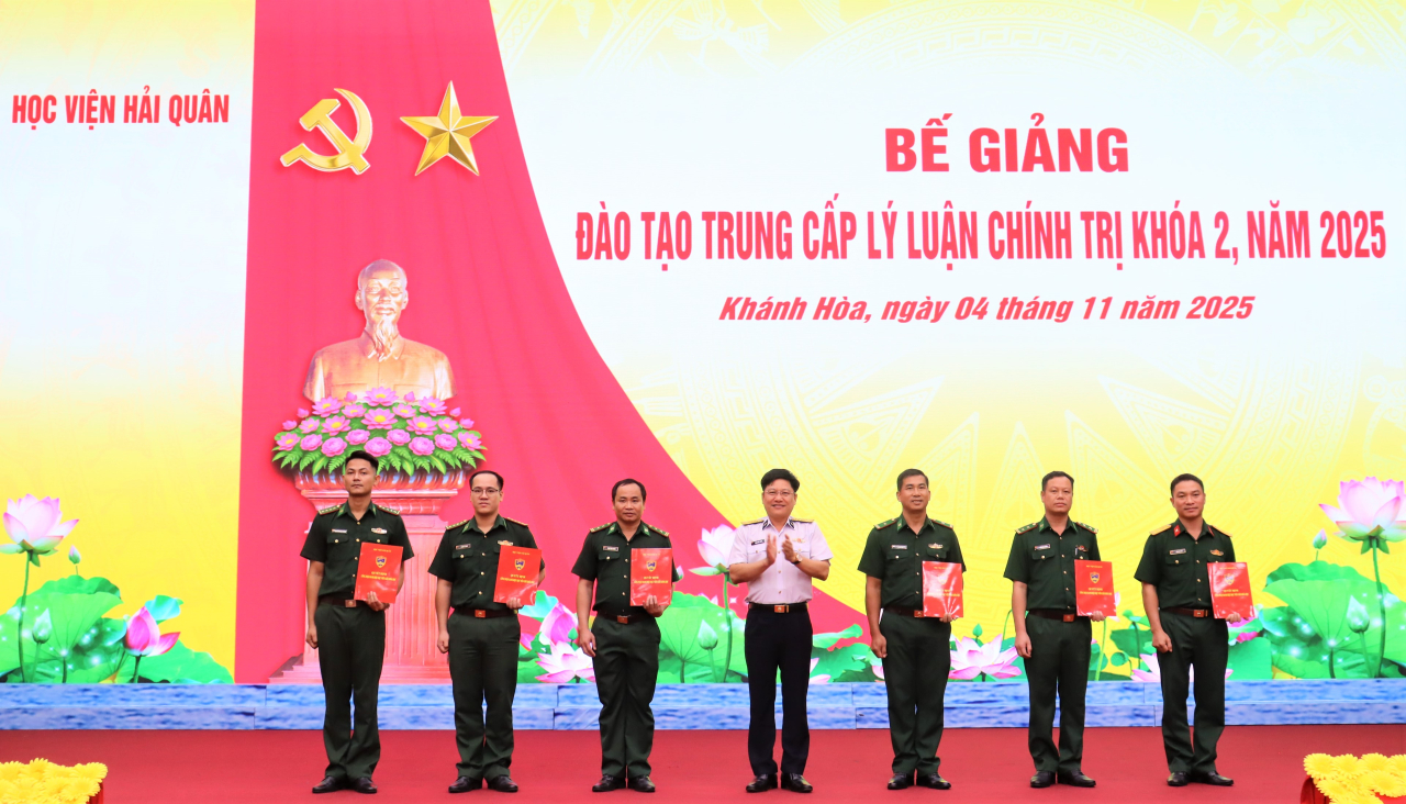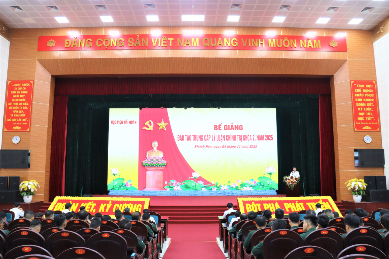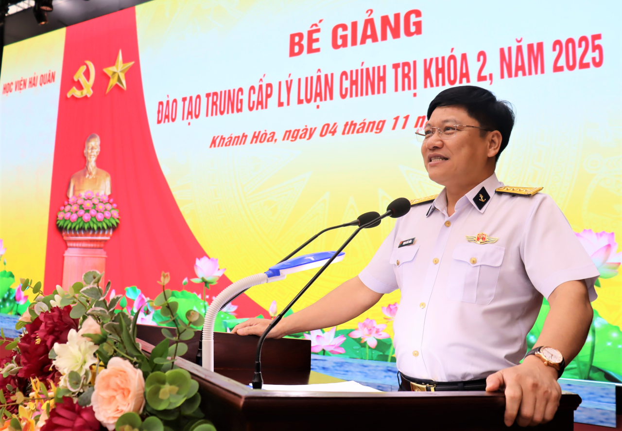HQ Online - Chiều 4/11, tại tỉnh Khánh Hòa, Học viện Hải quân tổ chức bế giảng đào tạo trung cấp lý luận chính trị khóa 2. Đại tá Phạm Đức Hùng, Phó Chính uỷ Học viện dự và chủ trì.