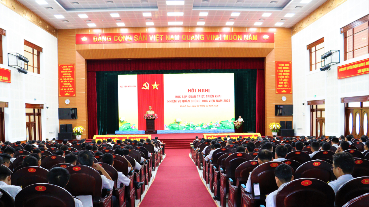 HQ Online - Chiều 2/2, tạị tỉnh Khánh Hoà, Học viện Hải quân tổ chức Hội nghị học tập, quán triệt, triển khai nhiệm vụ của Quân chủng, Học viện năm 2026. Chuẩn Đô đốc Ngô Thành Công, Giám đốc Học viện chủ trì và trực tiếp quán triệt nội dung.