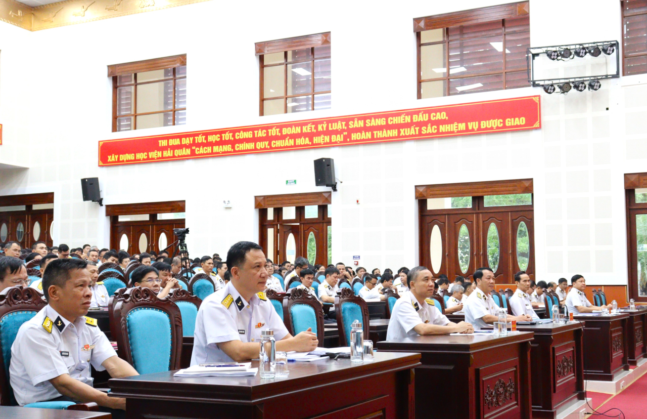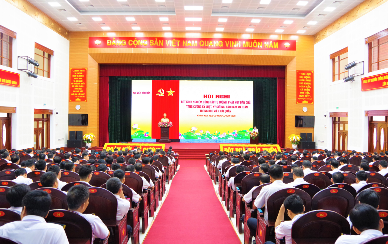 HQ Online - Chiều 25/12, tại tỉnh Khánh Hòa, Học viện Hải quân tổ chức Hội nghị rút kinh nghiệm công tác tư tưởng, phát huy dân chủ, tăng cường kỷ luật, kỷ cương và bảo đảm an toàn năm 2025. Chuẩn Đô đốc Nguyễn Hữu Thoan, Bí thư Đảng uỷ, Chính uỷ Học viện chủ trì.