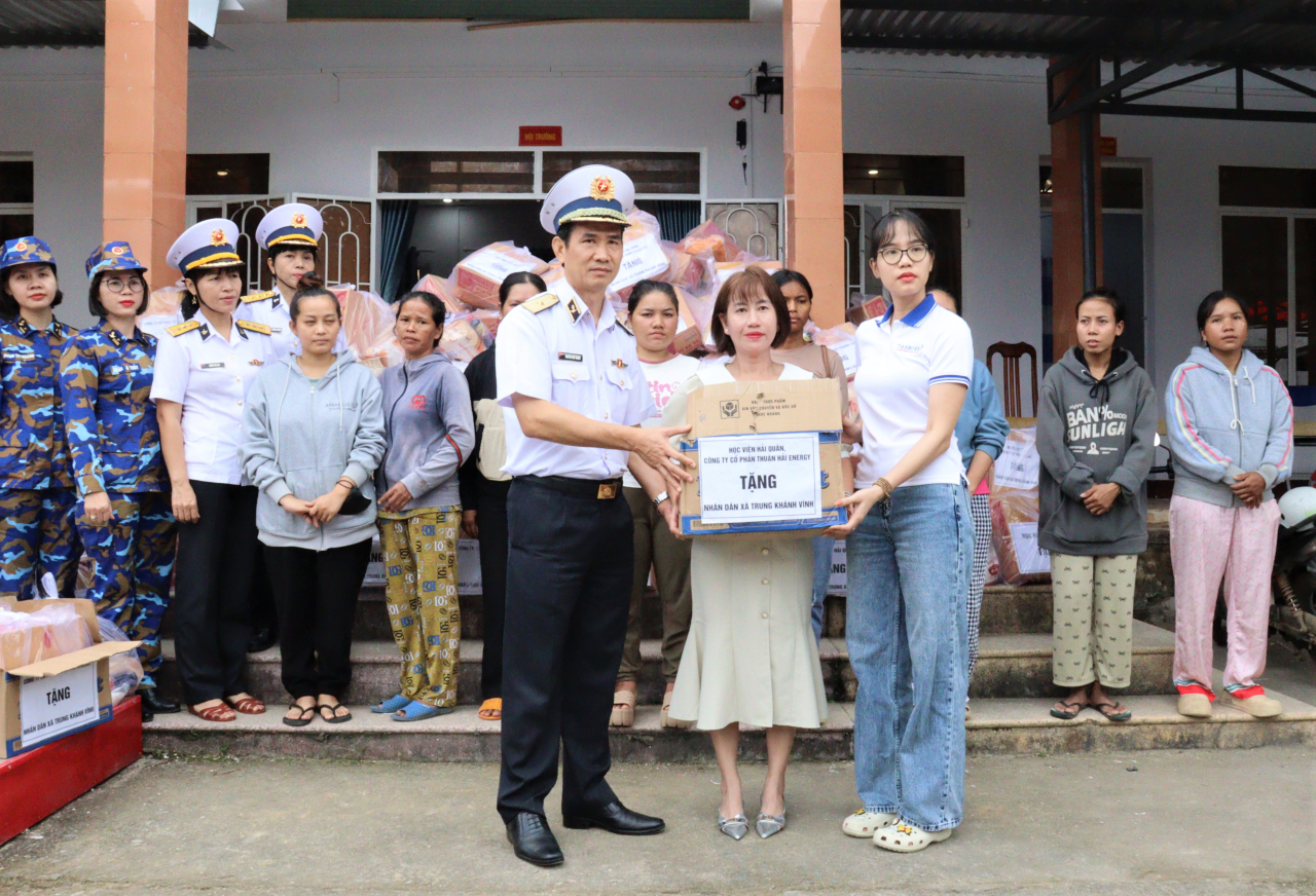 HQ Online - Sáng 26/11, Học viện Hải quân phối hợp Công ty cổ phần Thuận Hải (Thành phố Hồ Chí Minh) tổ chức đoàn công tác đến thăm, tặng quà và động viên nhân dân chịu ảnh hưởng của mưa lũ tại các xã Diên Điền, Trung Khánh Vĩnh của tỉnh Khánh Hòa. Chuẩn Đô đốc Nguyễn Hữu Thoan, Chính ủy Học viện làm trưởng đoàn; cùng đi có bà Nguyễn Thị Hà Tiên, đại diện Công ty cổ phần Thuận Hải.
