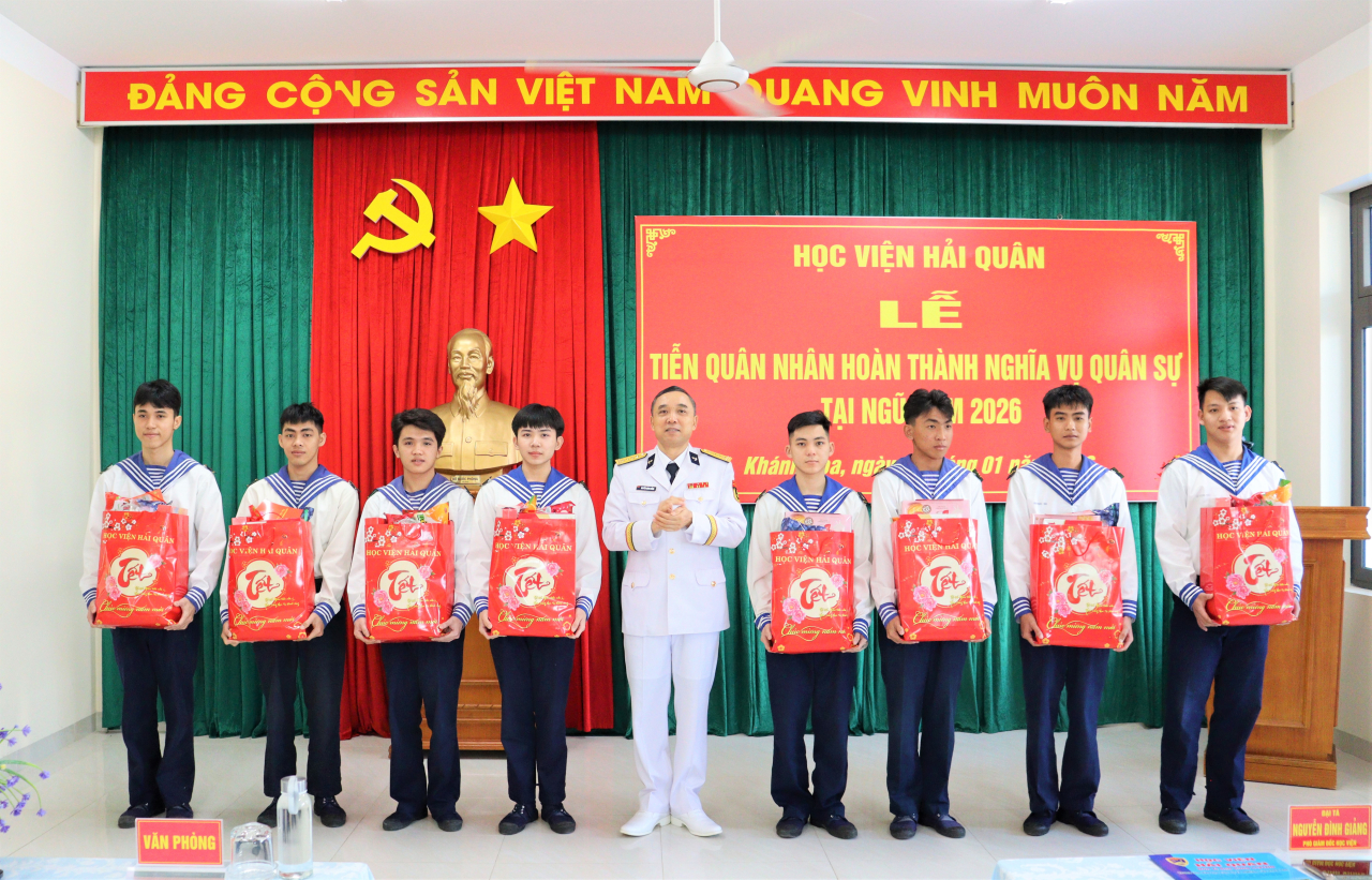 HQ Online - Ngày 27/1, tại Khánh Hoà, Học viện Hải quân tổ chức Lễ tiễn quân nhân hoàn thành nghĩa vụ quân sự tại ngũ năm 2026. Đại tá Nguyễn Đình Giảng, Phó Giám đốc Học viện chủ trì. Tham dự hội nghị có đại biểu cơ quan, đơn vị và các đồng chí hạ sĩ quan, binh sĩ hoàn thành nghĩa vụ quân sự tại ngũ năm 2026.