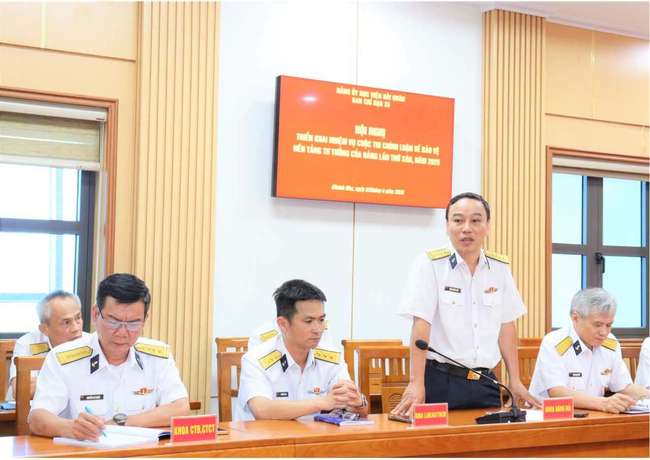 HQ Online - Chiều 3/4, tại tỉnh Khánh Hòa, Ban Chỉ đạo 35 Đảng ủy Học viện Hải quân tổ chức Hội nghị triển khai nhiệm vụ Cuộc thi chính luận bảo vệ nền tảng tư tưởng của Đảng lần thứ 6, năm 2026 trong Học viện Hải quân. Đại tá Phạm Đức Hùng, Phó Chính ủy Học viện, Trưởng ban tổ chức Cuộc thi chủ trì.