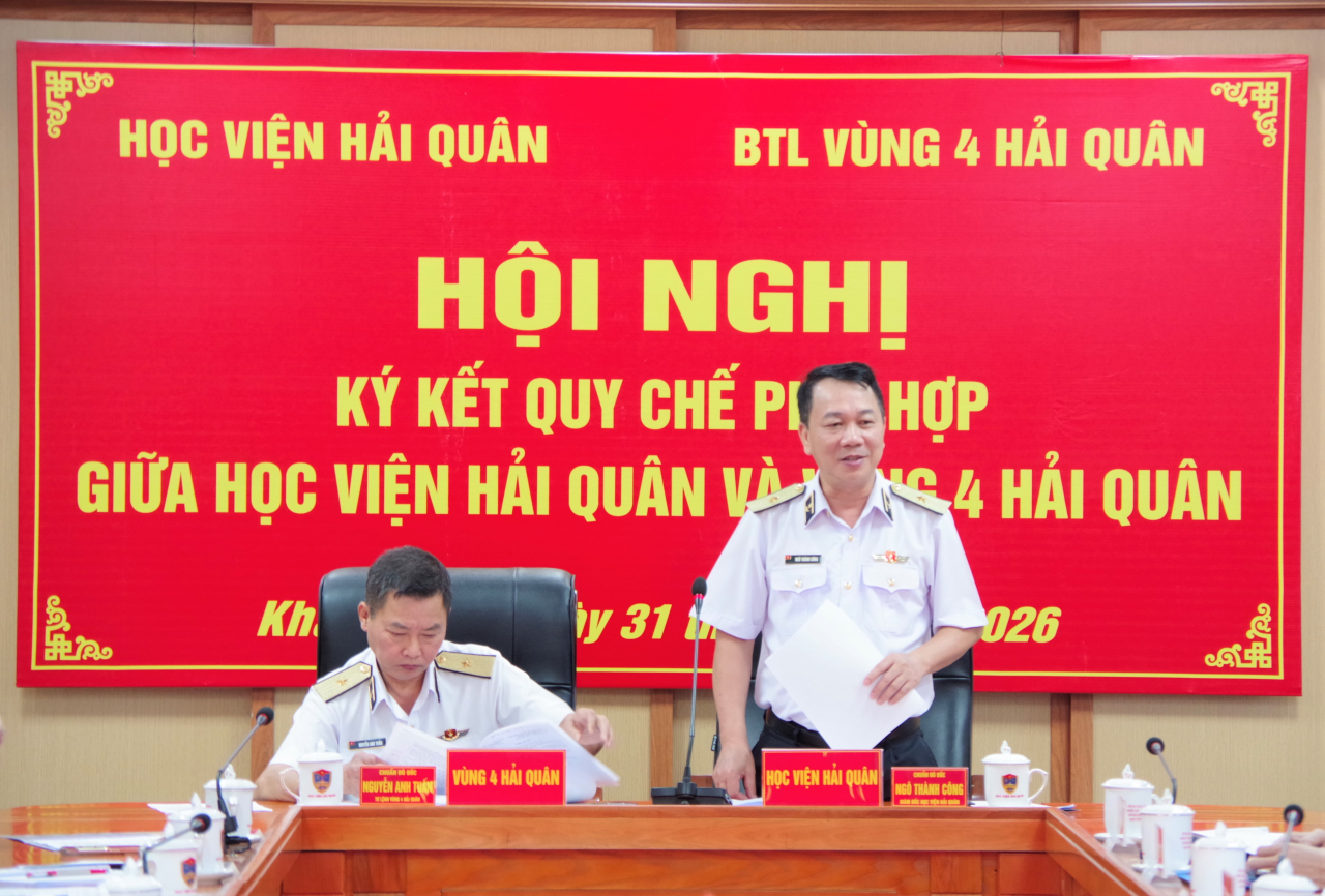 HQ Online - Chiều 31/3, Học viện Hải quân và Vùng 4 Hải quân tổ chức Hội nghị ký kết Quy chế phối hợp trong công tác huấn luyện, đào tạo và nghiên cứu khoa học. Chuẩn Đô đốc, PGS, TS Ngô Thành Công, Giám đốc Học viện Hải quân và Chuẩn Đô đốc Nguyễn Anh Tuấn, Tư lệnh Vùng 4 Hải quân đồng chủ trì.