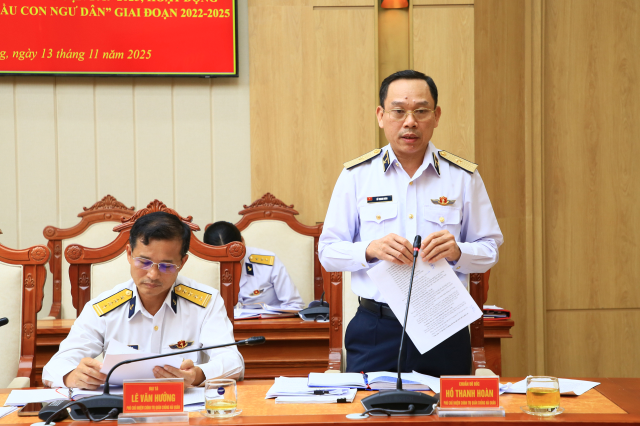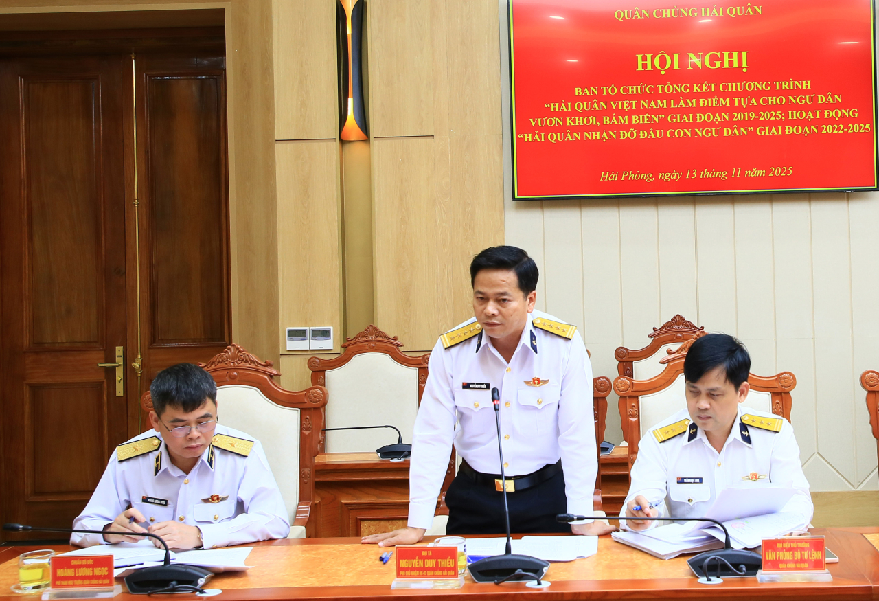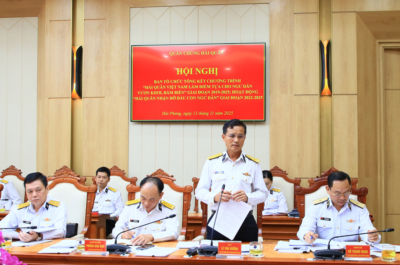 HQVN - Chiều 13/11, tại Hải Phòng, Quân chủng Hải quân tổ chức Hội nghị Ban tổ chức tổng kết chương trình "Hải quân Việt Nam làm điểm tựa cho ngư dân vươn khơi, bám biển” giai đoạn 2019-2025; hoạt động “Hải quân nhận đỡ đầu con ngư dân” giai đoạn 2022-2025. Chuẩn Đô đốc Đỗ Văn Yên, Phó Chính ủy Hải quân chủ trì hội nghị.