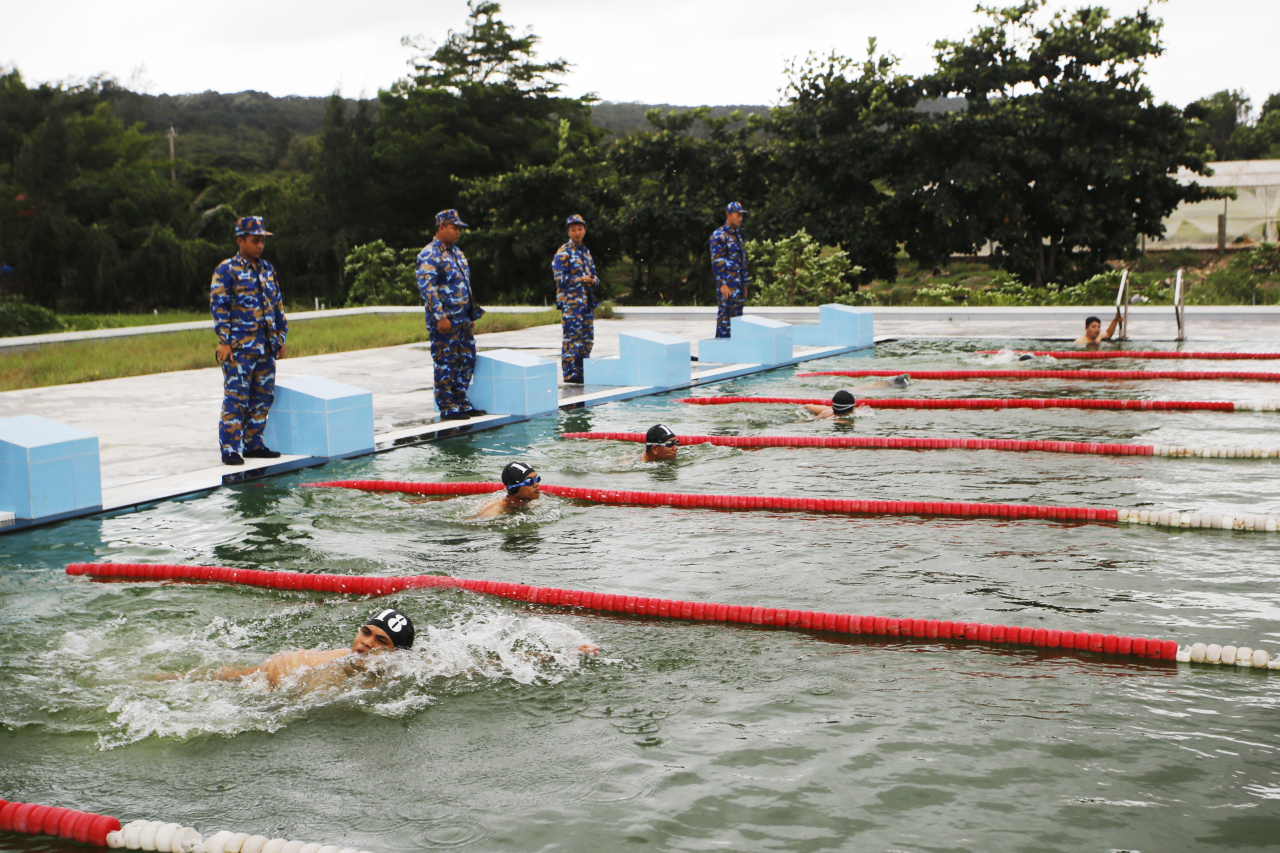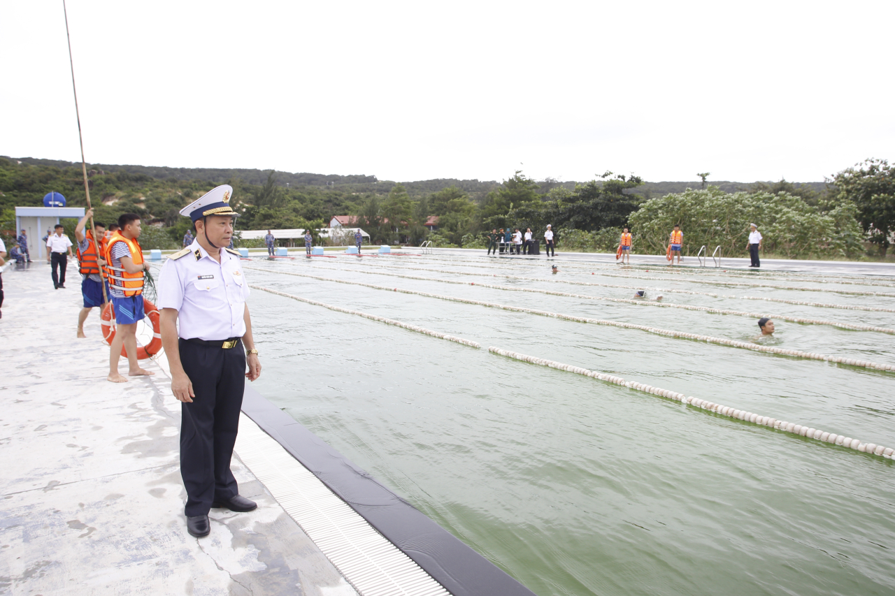Chuẩn Đô đốc Nguyễn Thiên Quân, Phó Tham mưu trưởng Hải quân theo dõi cán bộ, chiến sĩ tham gia kiểm tra bơi