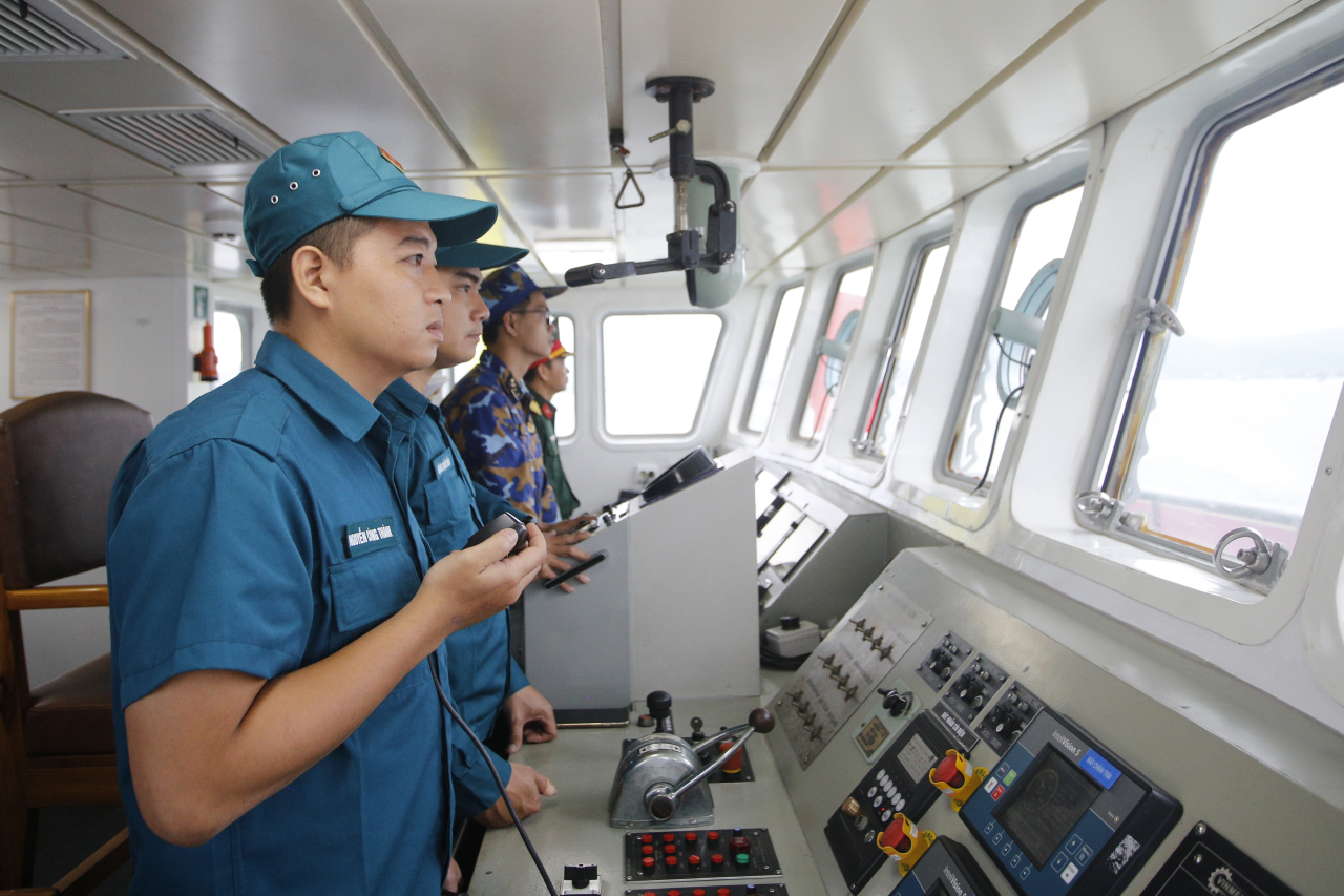 Cán bộ, chiến sĩ trên buồng hành trình điều hành tàu rời bến và xử lý các tình huống