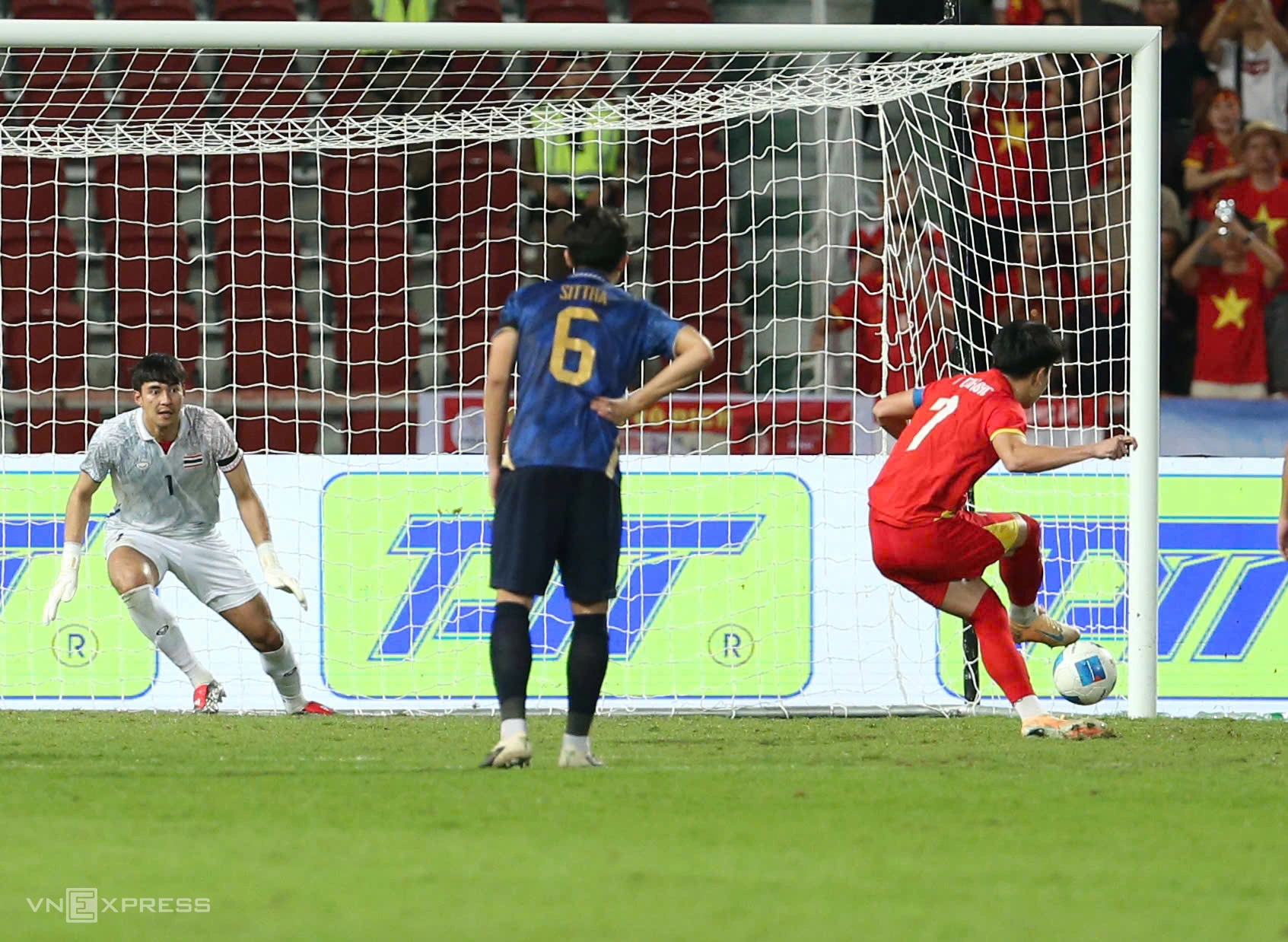 Đội trưởng Việt Nam dùng sức rướn đẩy bóng vượt qua đối phương, buộc thủ thành Thái Lan phạm lỗi trong vòng cấm. Trên chấm 11m, chính Đình Bắc dứt điểm thành công, rút ngắn tỷ số xuống 1-2 cho Việt Nam