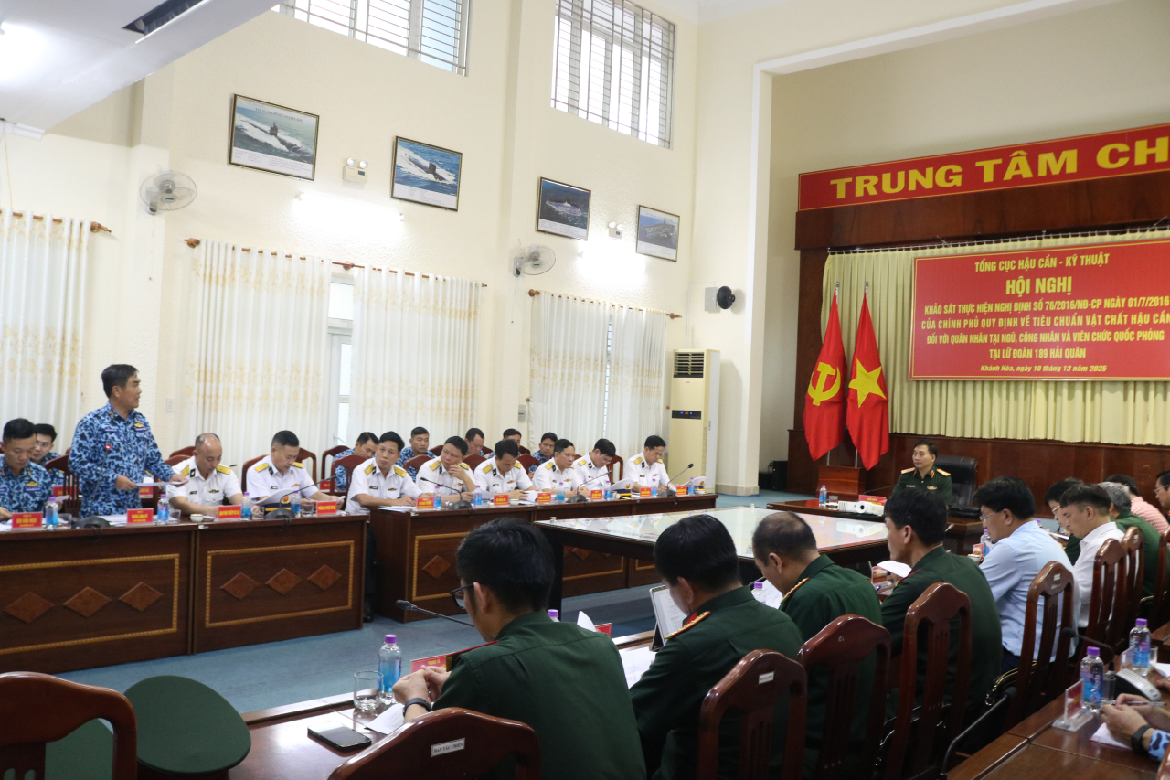 HQ Online - Chiều 10/12, tại phường Bắc Cam Ranh, tỉnh Khánh Hòa, Tổng cục Hậu cần - Kỹ thuật đã tổ chức Hội nghị khảo sát về tiêu chuẩn vật chất hậu cần đối với quân nhân tại ngũ, công nhân và viên chức quốc phòng tại Lữ đoàn 189 Hải quân. Thiếu tướng Nguyễn Trọng Thiện, Phó chủ nhiệm Tổng cục Hậu cần - Kỹ thuật chủ trì.