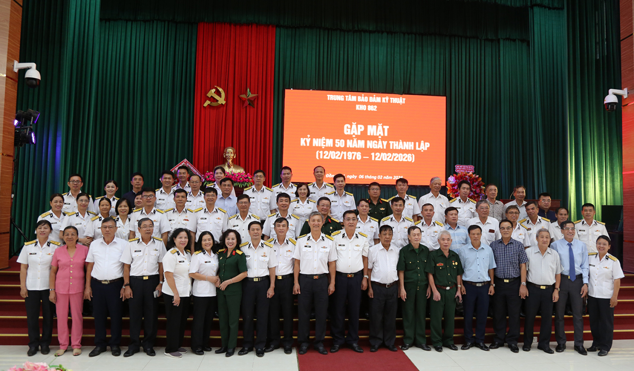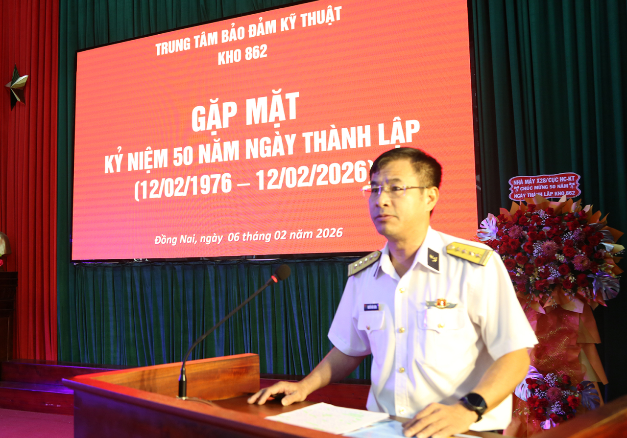 HQ Online - Ngày 6/2, tại xã Nhơn Trạch (tỉnh Đồng Nai), Kho 862, Trung tâm Bảo đảm kỹ thuật (BĐKT) Vùng 2 Hải quân long trọng tổ chức kỷ niệm 50 năm Ngày thành lập (12/2/1976 - 12/2/2026). Dự kỷ niệm có Đại tá Đinh Quang Uy, Chủ nhiệm Hậu cần-Kỹ thuật Vùng 2; Đại tá Nguyễn Hữu Lương, Chính ủy Trung tâm BĐKT Vùng 2; đại diện cấp ủy, chính quyền địa phương, cơ quan Bộ Tư lệnh Vùng 2; đơn vị bạn và cán bộ, chiến sĩ Kho 862 qua các thời kỳ.