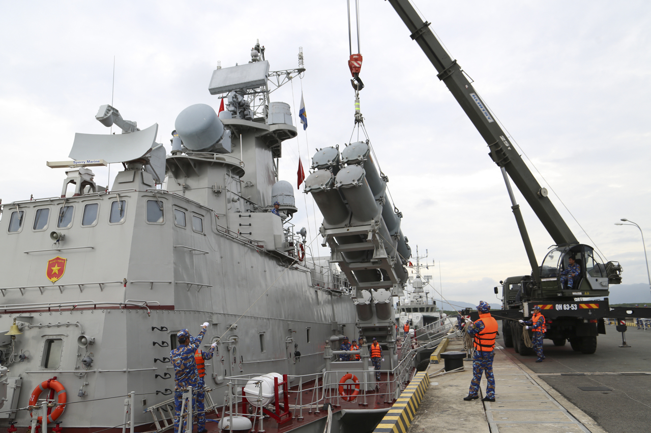 Tàu 383 huấn luyện thực hành cẩu nhận tên lửa
