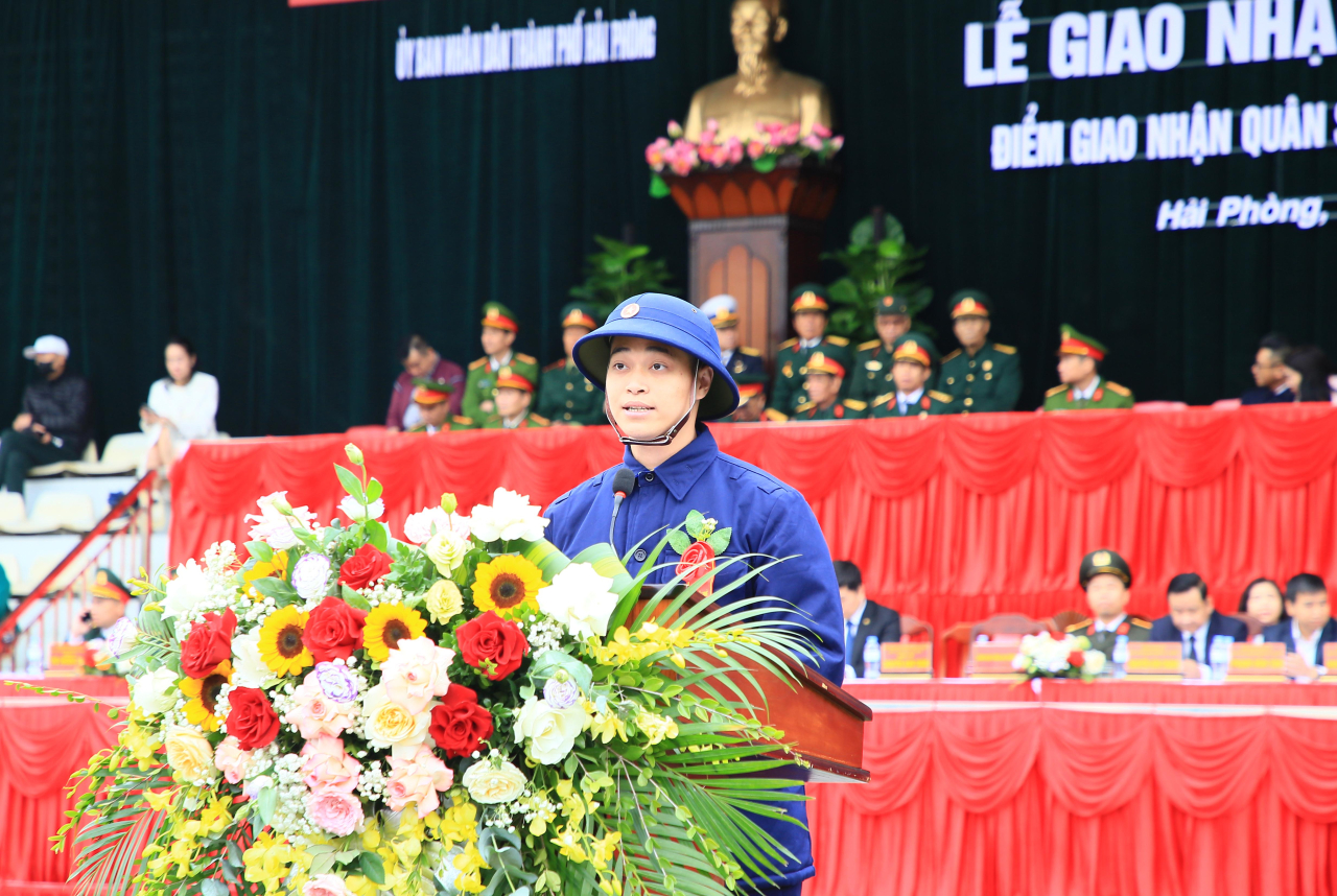 Tại buổi lễ, đại diện thanh niên nhập ngũ, công dân Phạm Thành An, phường Lê Chân (nhập ngũ vào Lữ đoàn Công binh 131 Hải quân) bày tỏ niềm vinh dự và tự hào khi được đứng trong hàng ngũ Quân đội nhân dân Việt Nam.
