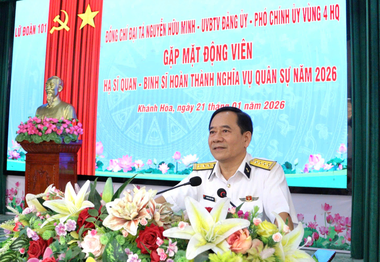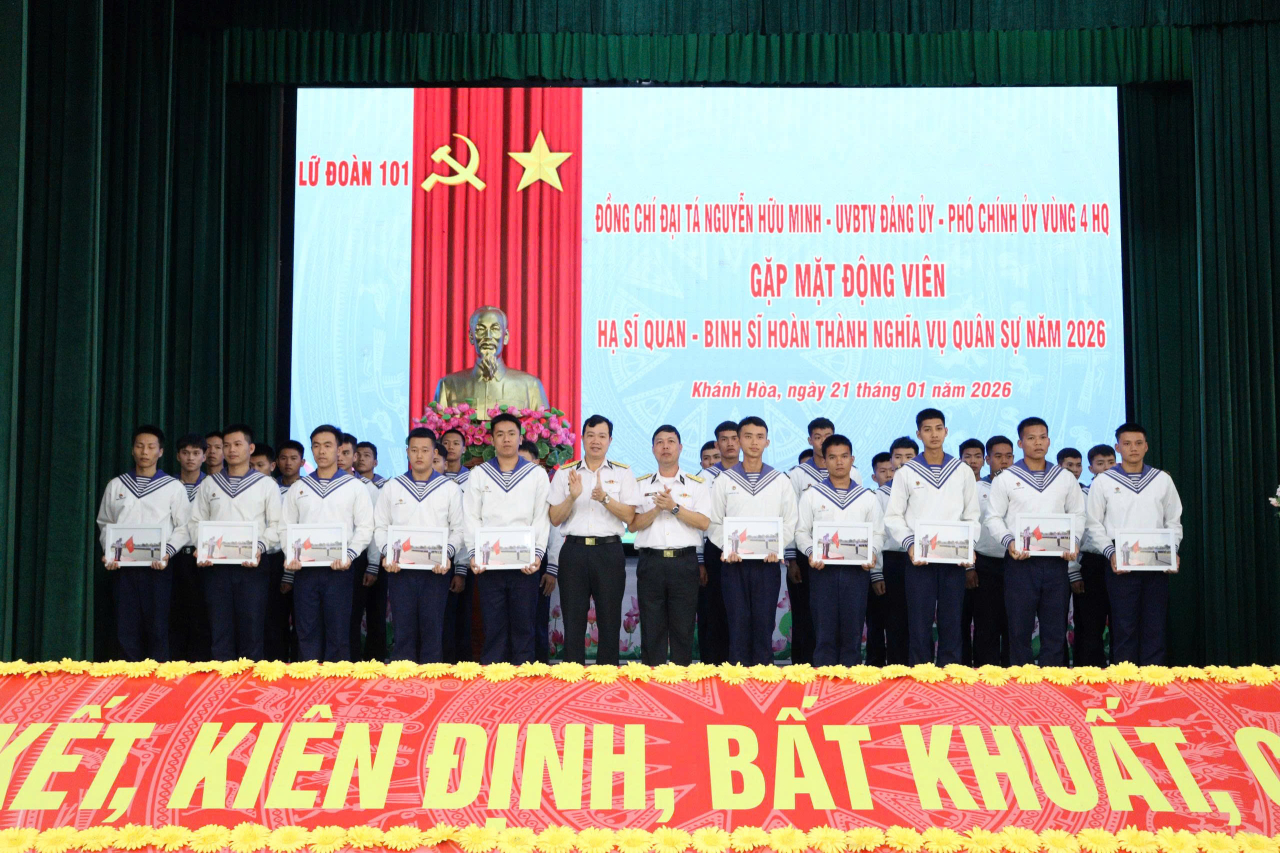 HQ Online - Sáng 21/1, tại xã Cam Lâm, tỉnh Khánh Hòa, Lữ đoàn 101, Vùng 4 Hải quân tổ chức gặp mặt, động viên hạ sĩ quan-binh sĩ (HSQ-CS) hoàn thành nghĩa vụ quân sự năm 2026. Đại tá Nguyễn Hữu Minh, Phó Chính ủy Vùng 4 Hải quân đến dự và chỉ đạo.
