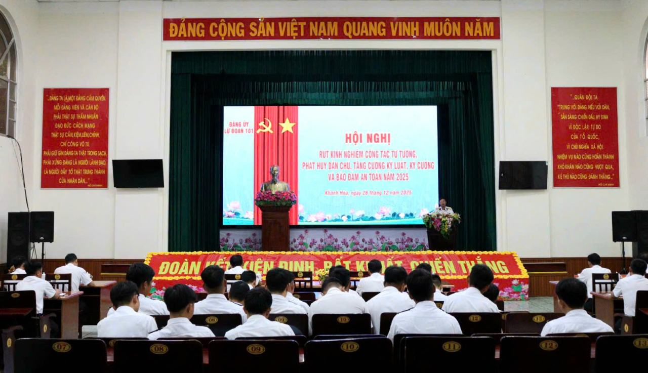 HQ Online - Ngày 26/12, tại xã Cam Lâm, tỉnh Khánh Hòa, Lữ đoàn 101, Vùng 4 Hải quân tổ chức hội nghị rút kinh nghiệm công tác quản lý tư tưởng, phát huy dân chủ, tăng cường kỷ luật, kỷ cương và bảo đảm an toàn năm 2025. Đại tá Phạm Duy Hướng, Bí thư Đảng ủy, Chính ủy Lữ đoàn chủ trì.