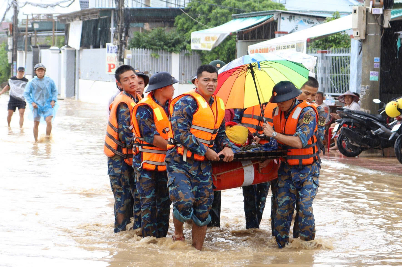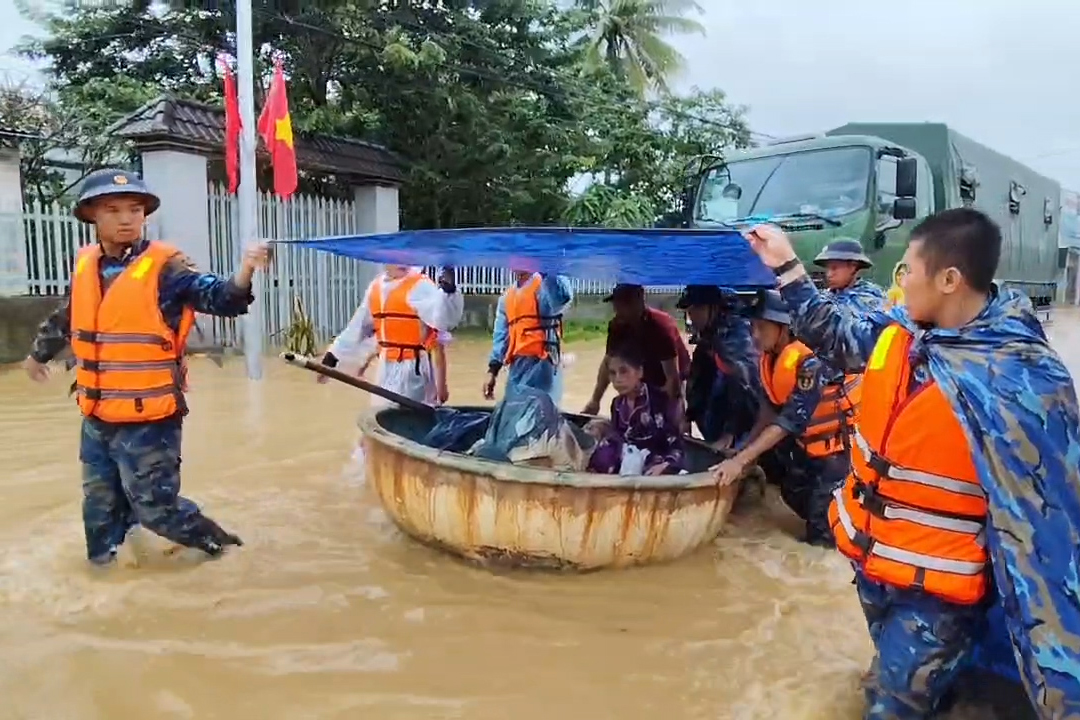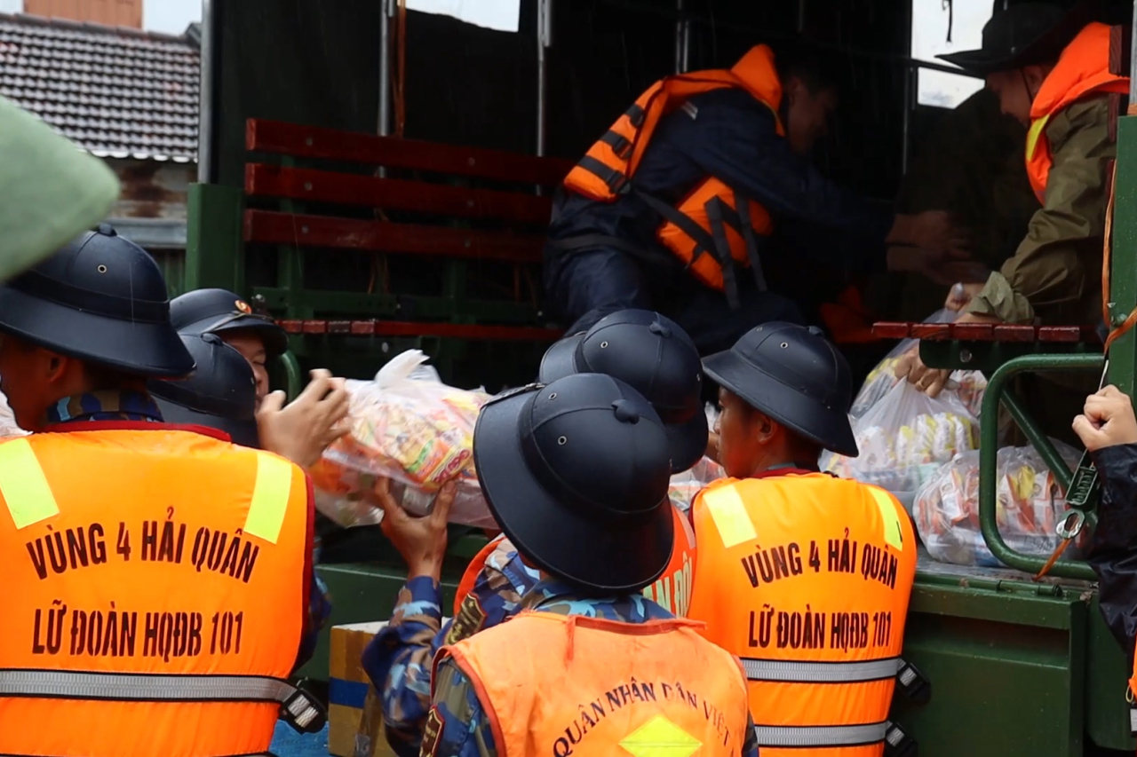 HQ Online - Trong ngày 21/11, tình trạng mưa lớn vẫn tiếp diễn, phường Tây Nha Trang, tỉnh Khánh Hoà vẫn ngập sâu trong nước, nhiều hộ dân trong tình trạng nguy cấp, thiếu nước uống, lương thực, thực phẩm. Tại khu vực này, gần 100 cán bộ, chiến sĩ Lữ đoàn 101, Vùng 4 Hải quân vẫn đang túc trực và thực hiện nhiều biện pháp để ứng cứu nhân dân.