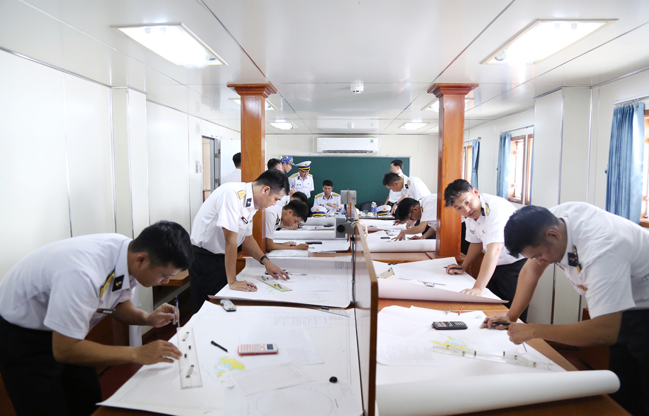 Trong nội dung kiểm tra, đối tượng cán bộ tàu được đánh giá toàn diện về năng lực chỉ huy, quản lý, tổ chức thực hiện nhiệm vụ. Từng đồng chí đã thực hành tác nghiệp trên hải đồ, xử lý tình huống chiến thuật, vận động tàu, sử dụng cơ yếu, thông tin liên lạc và báo cáo chỉ huy theo quy định.