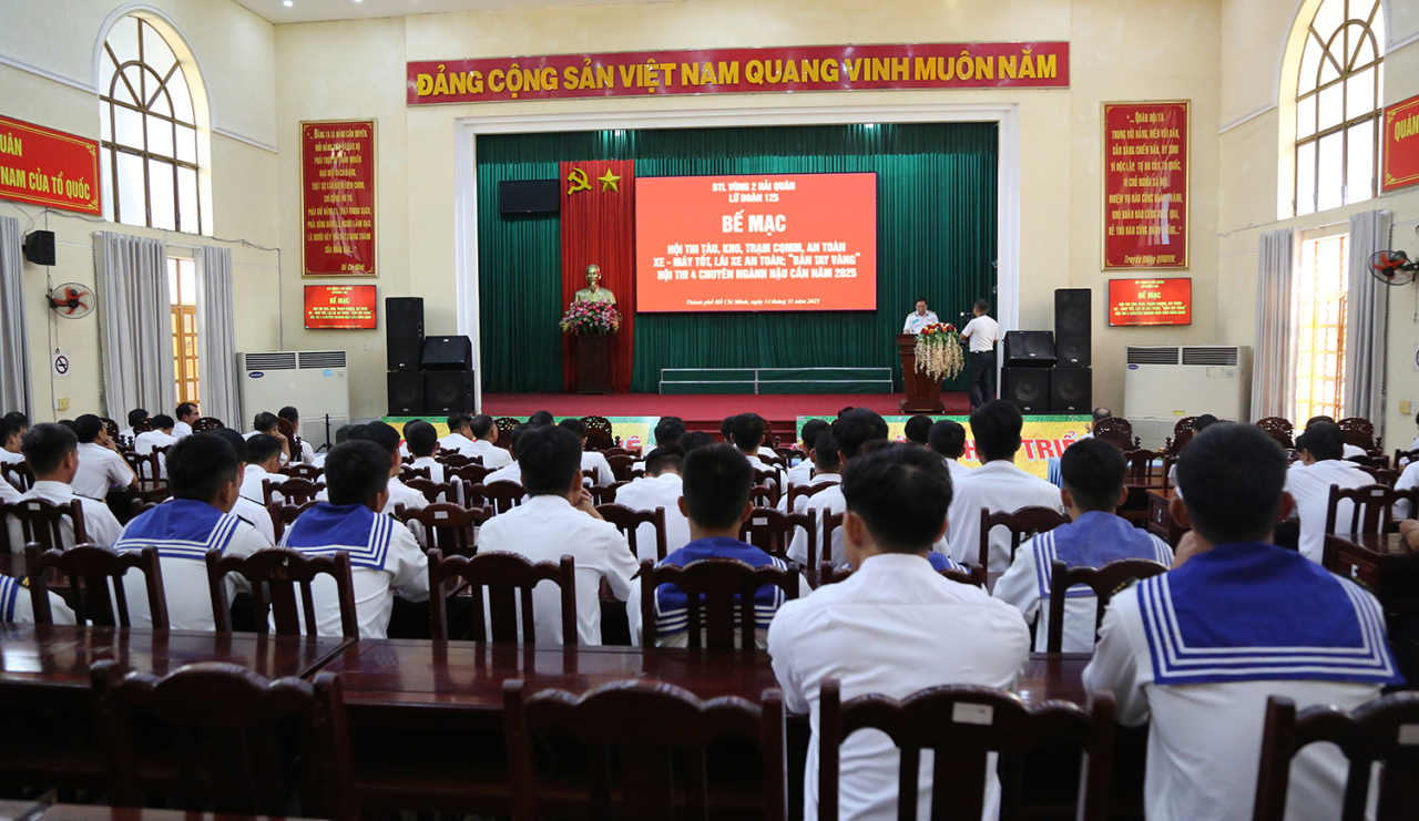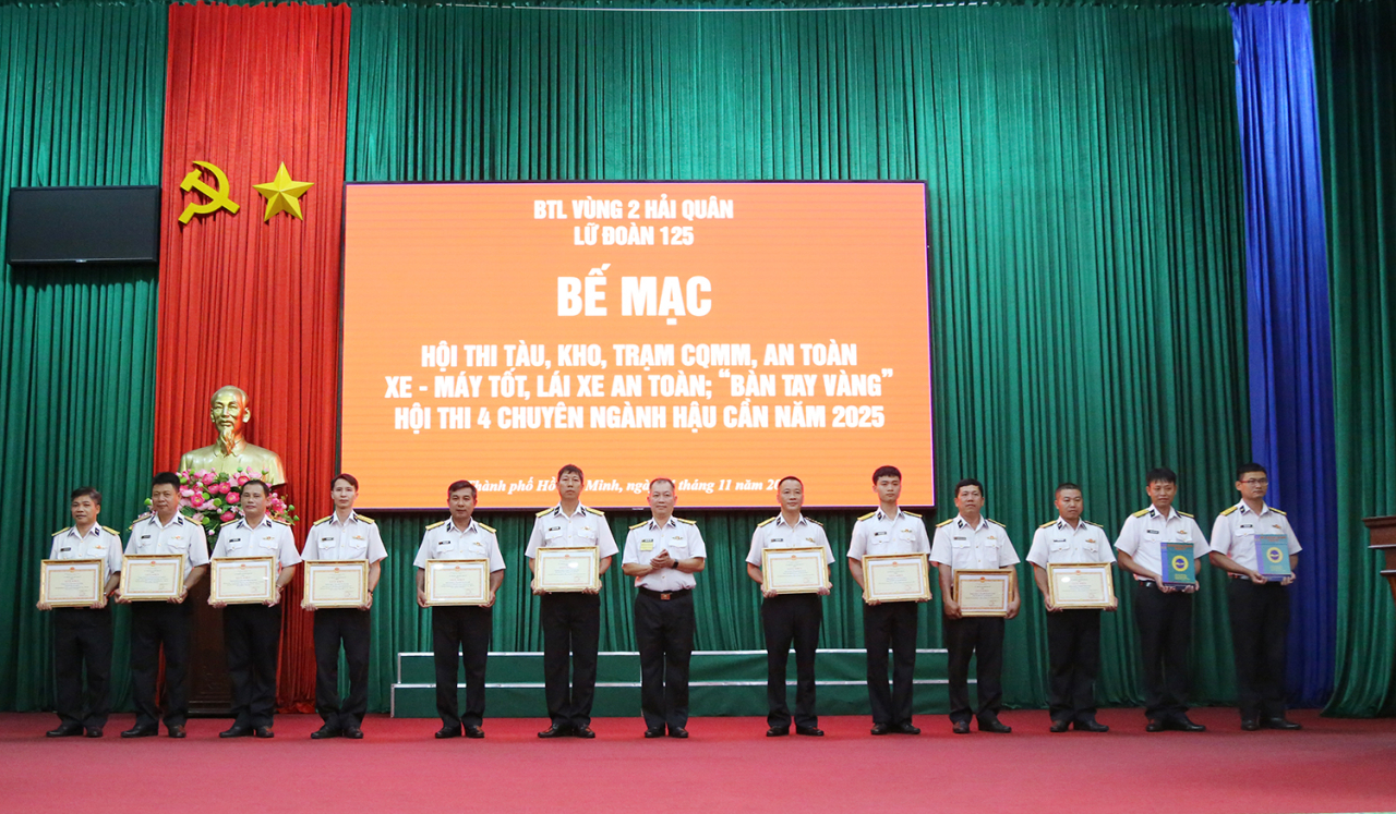 HQ Online - Chiều 14/11, tại TP Hồ Chí Minh, Lữ đoàn 125 (Vùng 2 Hải quân) tổ chức bế mạc Hội thi tàu, kho trạm chính quy mẫu mực; xe - máy tốt, lái xe an toàn; “Bàn tay vàng” và Hội thi 4 chuyên ngành hậu cần. Kết quả 100% thí sinh đạt yêu cầu, trong đó trên 70% khá giỏi, qua đó khẳng định tinh thần vượt khó, quyết tâm hoàn thành nhiệm vụ của cán bộ, chiến sĩ toàn Lữ đoàn.