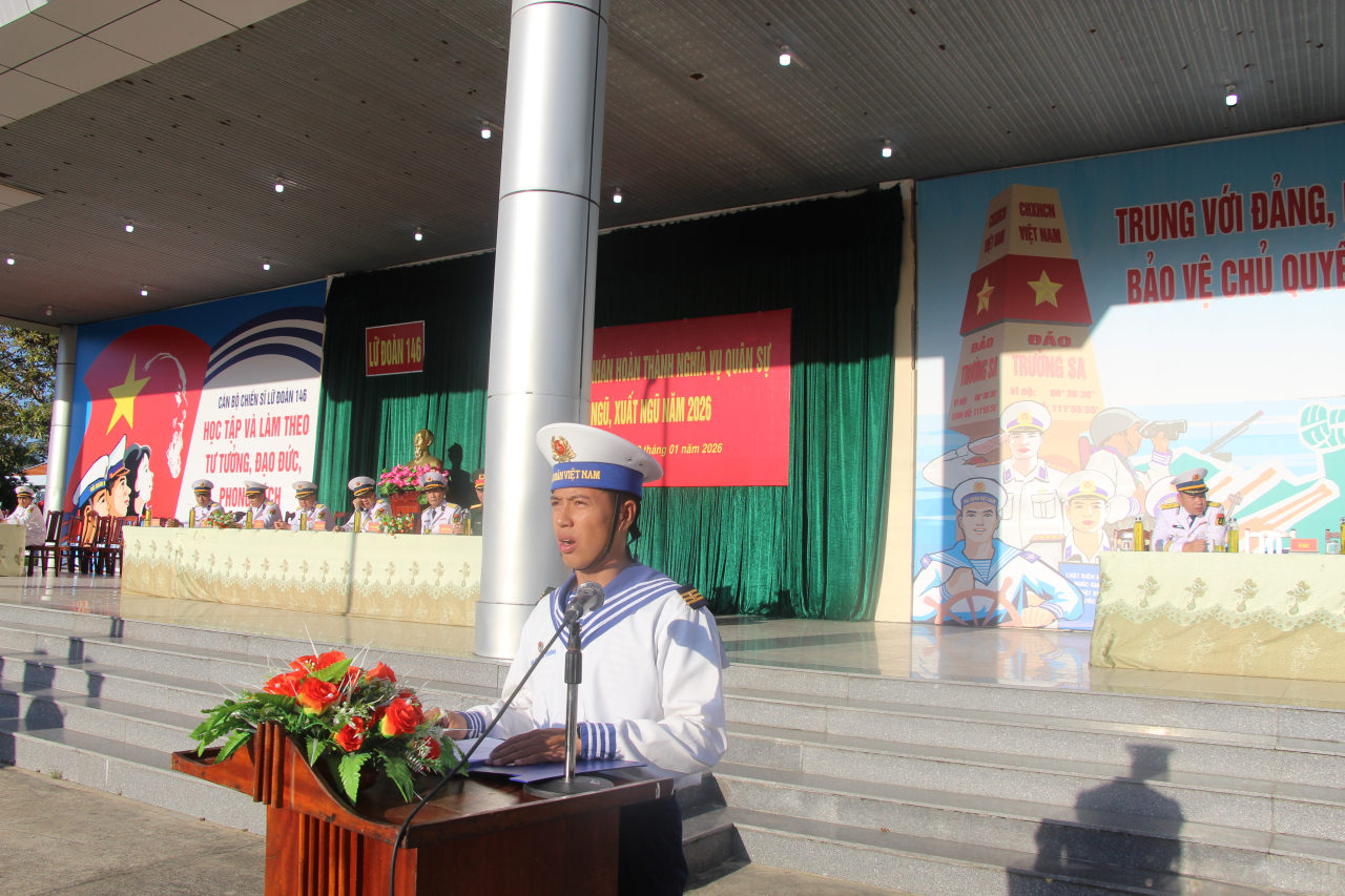 HQ Online - Ngày 28/1, tại phường Bắc Cam Ranh (tỉnh Khánh Hòa), Lữ đoàn 146 (Vùng 4 Hải quân) tổ chức Lễ tiễn quân nhân hoàn thành nghĩa vụ quân sự tại ngũ năm 2026. Dự buổi lễ có Đại tá Nguyễn Vĩnh Nam, Phó Tư lệnh Vùng; Đại tá Nguyễn Văn Hải, Chỉ huy trưởng Ban chỉ huy phòng thủ Khu vực 3 - Cam Lâm; đại diện cơ quan Bộ Tư lệnh Vùng; chỉ huy Lữ đoàn, các cơ quan, đơn vị trực thuộc cùng hơn 700 hạ sĩ quan, binh sĩ (HSQ, BS) xuất ngũ đợt này.