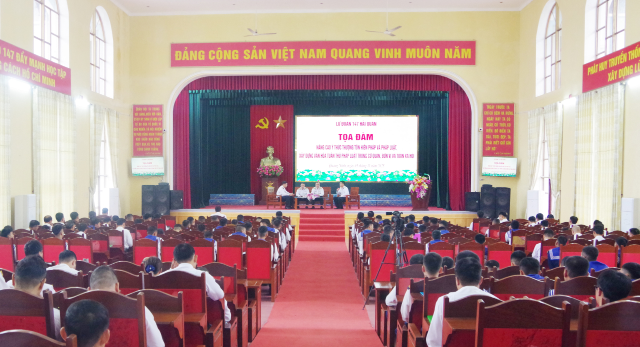 HQ Online - Sáng 5/11, tại Quảng Ninh, Lữ đoàn 147, Vùng 1 Hải quân tổ chức tọa đàm với chủ đề “Nâng cao ý thức thượng tôn hiến pháp và pháp luật, xây dựng văn hóa tuân thủ pháp luật trong cơ quan, đơn vị và toàn xã hội” nhằm hưởng ứng Ngày pháp luật Việt Nam năm 2025. Đại tá Lê Tuấn Anh, Bí thư Đảng ủy, Chính ủy Lữ đoàn dự và chỉ đạo.