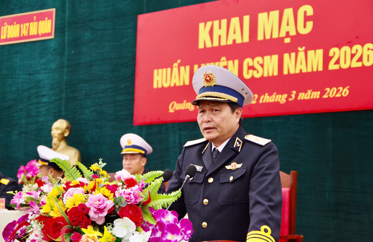 Phát biểu chỉ đạo tại buổi khai mạc, Chuẩn Đô đốc Vũ Văn Nam biểu dương những thành tích Lữ đoàn 147 đã đạt được trong năm 2025, nhất là nhiệm vụ tiếp nhận và huấn luyện CSM. Trước yêu cầu nhiệm vụ bảo vệ chủ quyền biển đảo trong tình hình mới, đồng chí Tư lệnh Vùng nhấn mạnh việc huấn luyện CSM là bước chuyển quan trọng từ người công dân thành người chiến sĩ Hải quân cách mạng.