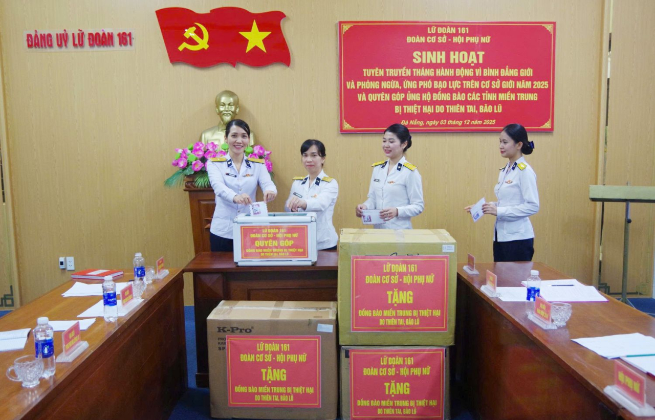 HQ Online - Chiều 3/12, tại TP. Đà Nẵng, Lữ đoàn 161, Vùng 3 Hải quân tổ chức sinh hoạt tuyên truyền tháng hành động vì bình đẳng giới; phòng ngừa, ứng phó với bạo lực trên cơ sở giới năm 2025 và quyên góp ủng hộ đồng bào thiệt hại do mưa lũ. Thượng tá Nguyễn Ngọc Nguyên, Phó Chính ủy Lữ đoàn dự, chỉ đạo.