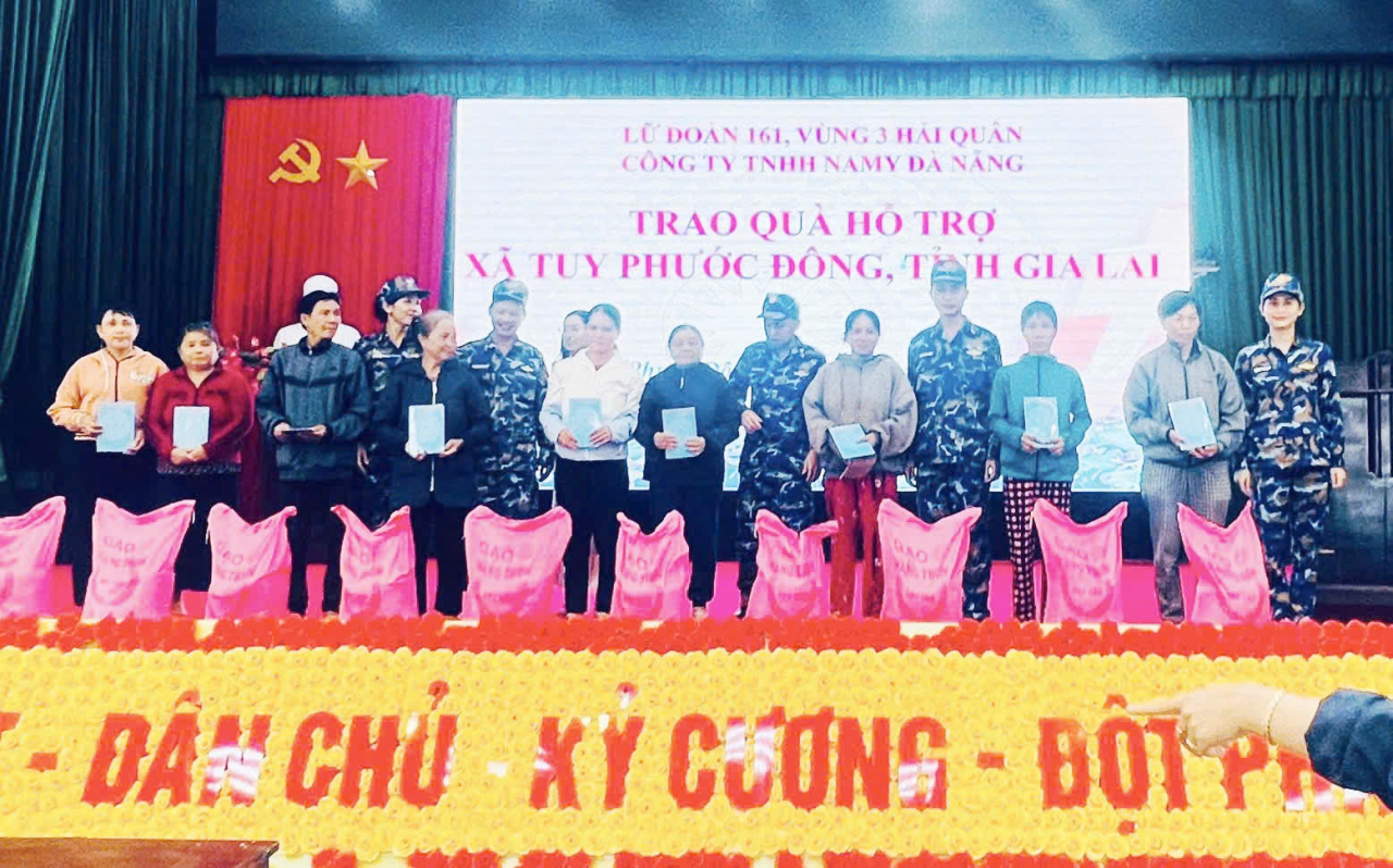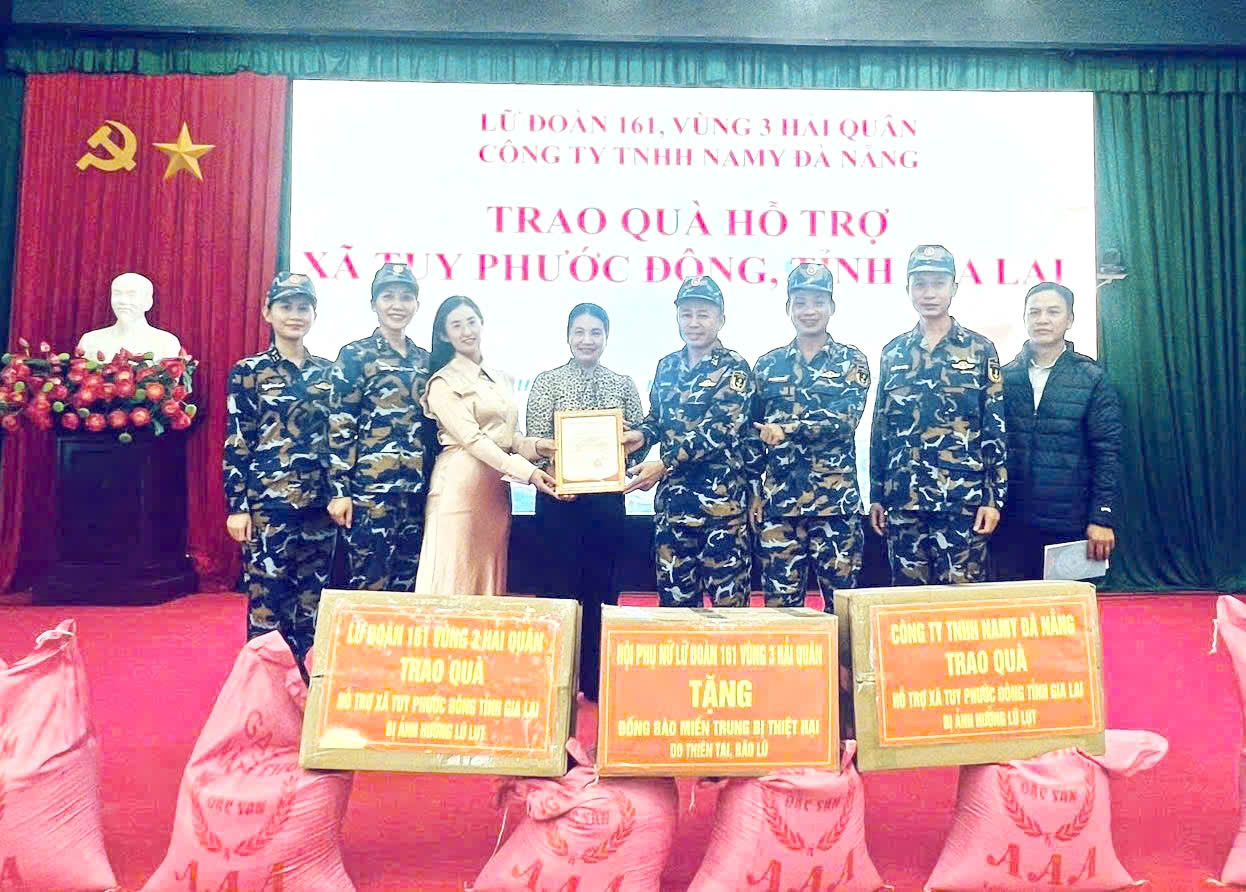 Tại địa bàn, Lữ đoàn 161 phối hợp cùng Công ty TNHH Na My Đà Nẵng và Hội phụ nữ Lữ đoàn 161 tặng quà 50 hộ dân bị thiệt hại nặng với tổng số tiền gần 30 triệu đồng.