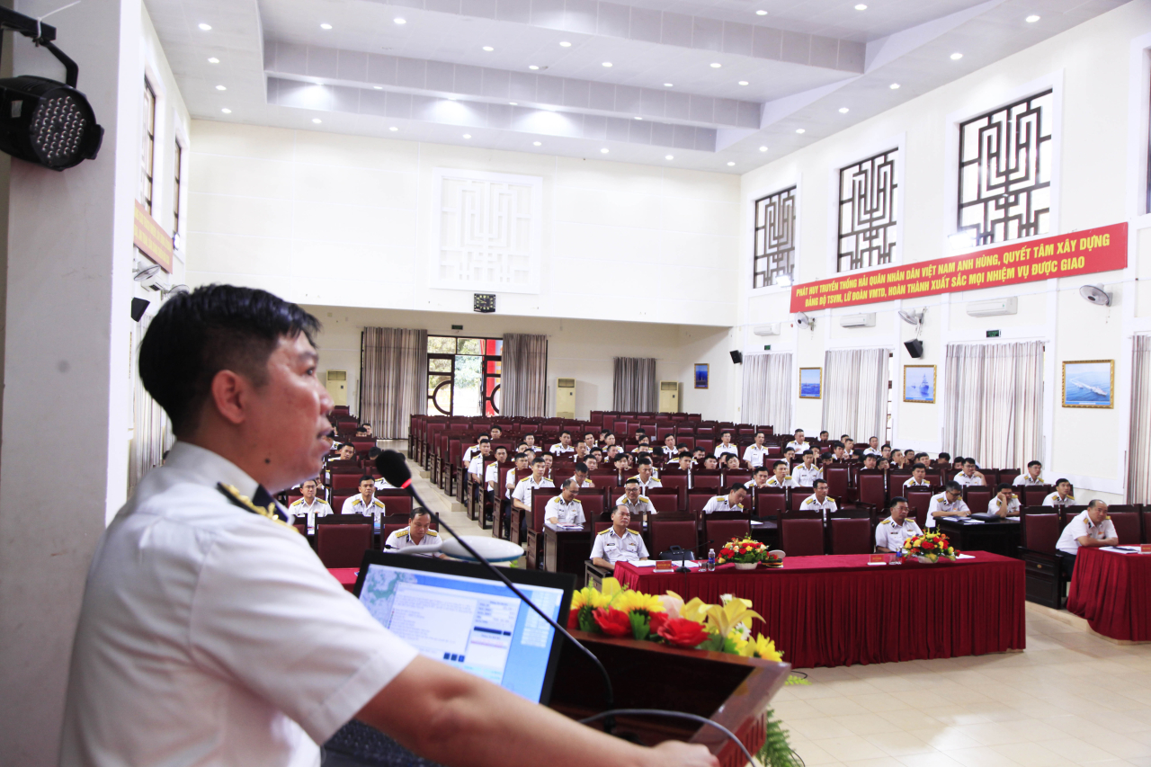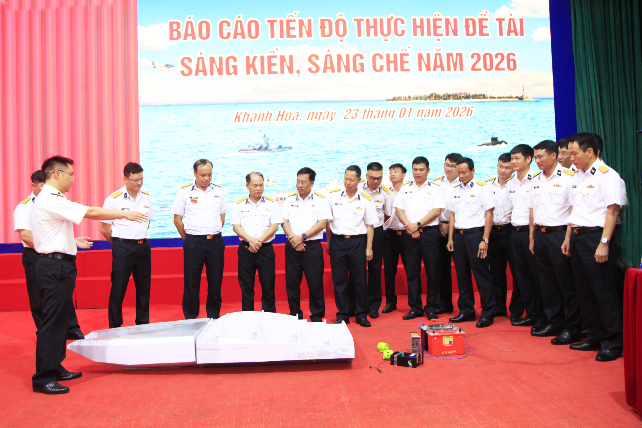 HQ Online - Chiều 23/1, tại phường Bắc Cam Ranh, tỉnh Khánh Hoà, Lữ đoàn 162, Vùng 4 Hải quân tổ chức Hội nghị báo cáo tiến độ thực hiện đề tài sáng kiến, sáng chế năm 2026. Đại tá Nguyễn Minh Lành, Phó Tham mưu trưởng Vùng dự, chỉ đạo. Thượng tá Trần Văn Vương, Lữ đoàn trưởng chủ trì.