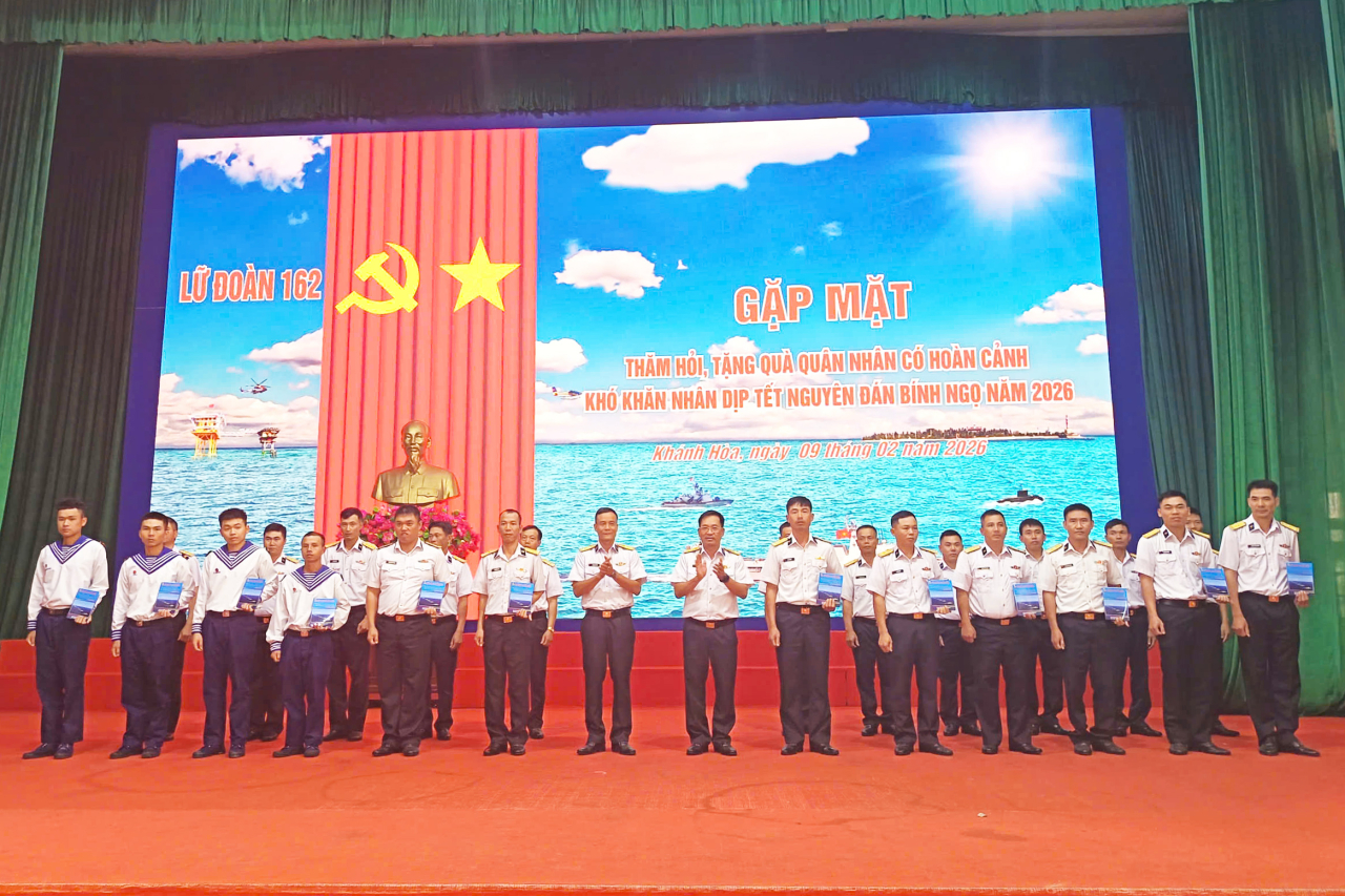 HQ Online - Sáng 9/2, tại phường Bắc Cam Ranh, tỉnh Khánh Hòa, Lữ đoàn 162, Vùng 4 Hải quân tổ chức gặp mặt, thăm hỏi, tặng quà cho các quân nhân có hoàn cảnh khó khăn đang công tác tại đơn vị nhân dịp Tết Nguyên đán Bính Ngọ 2026. Đại tá Mai Văn Doanh, Bí thư Đảng ủy, Chính ủy Lữ đoàn dự, chủ trì.