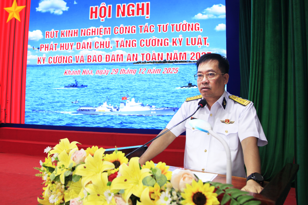HQ Online - Chiều 29/12, tại phường Bắc Cam Ranh, tỉnh Khánh Hoà, Lữ đoàn 162, Vùng 4 Hải quân tổ chức Hội nghị rút kinh nghiệm công tác quản lý tư tưởng, phát huy dân chủ, tăng cường kỷ luật, kỷ cương và bảo đảm an toàn năm 2025. Đại tá Mai Văn Doanh, Bí thư Đảng ủy, Chính ủy Lữ đoàn chủ trì.