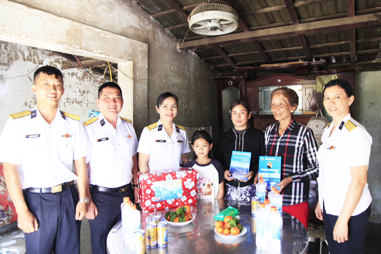 Tại gia đình cháu Mang Võ Khánh Băng (11 tuổi), con ngư dân Võ Xuân Đông và chị Mang Thị Tuyết Trinh và cháu Hoàng Trí Bảo (12 tuổi), con ngư dân Hoàng Trọng Nghĩa và chị Huỳnh Thị Xuân Thắm, Trung tá Bùi Vi Long, Chủ nhiệm Chính trị Lữ đoàn cùng đại diện Đoàn cơ sở và Hội phụ nữ đơn vị đã ân cần thăm hỏi sức khỏe, đời sống, tình hình chuẩn bị đón Tết của các gia đình; đồng thời động viên các cháu chăm ngoan, nỗ lực học tập, rèn luyện, phấn đấu trở thành những công dân có ích cho gia đình và xã hội.