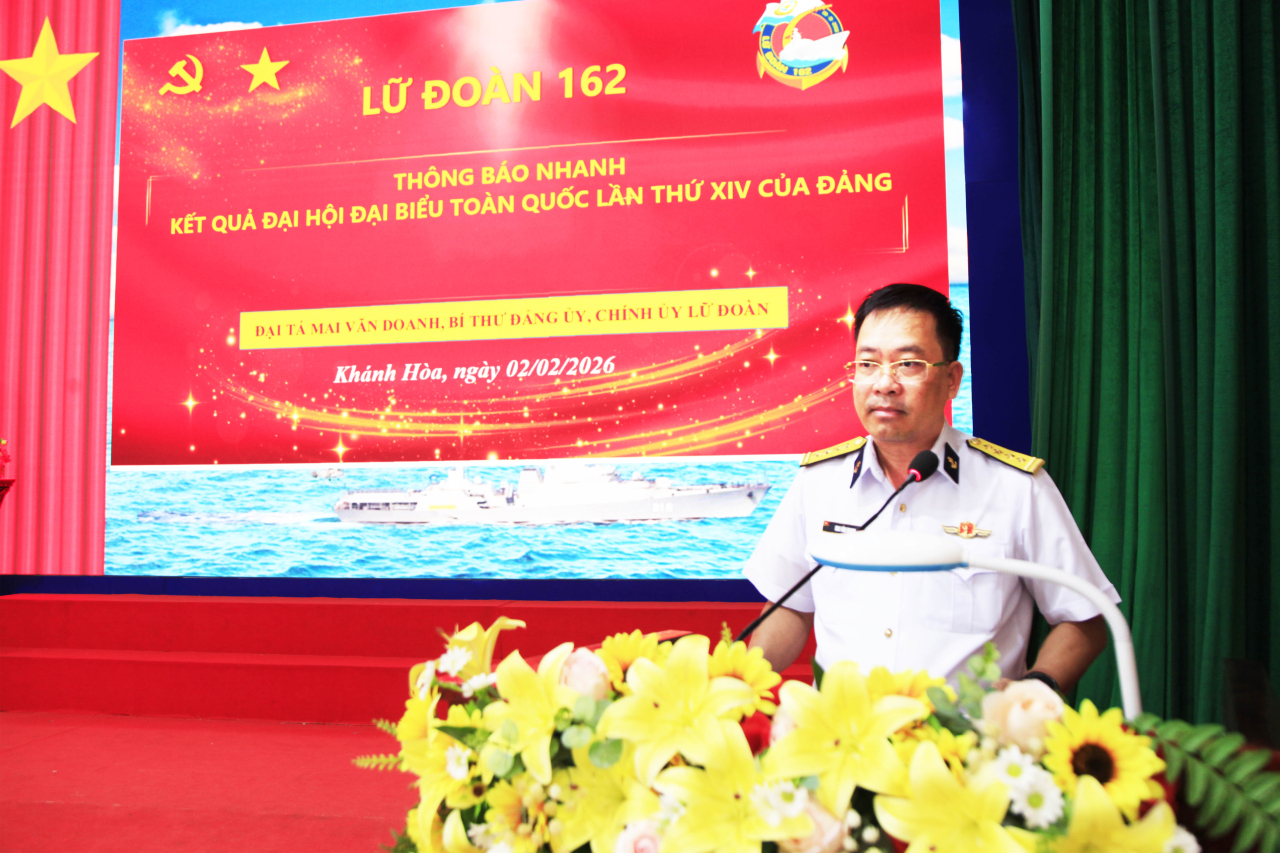 HQ Online - Ngày 2/2, tại phường Bắc Cam Ranh, tỉnh Khánh Hoà, Lữ đoàn 162, Vùng 4 Hải quân tổ chức Hội nghị thông báo nhanh kết quả Đại hội đại biểu toàn quốc lần thứ XIV của Đảng và quán triệt nhiệm vụ Quân chủng, Vùng, Lữ đoàn năm 2026. Đại tá Mai Văn Doanh, Bí thư Đảng ủy, Chính ủy Lữ đoàn chủ trì, thực hiện nội dung.