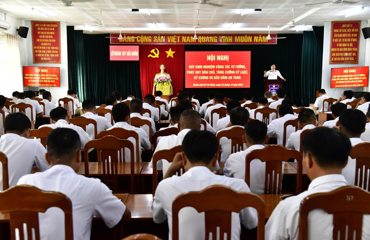 HQ Online - Sáng 24/12, tại xã Long Sơn (TP Hồ Chí Minh), Lữ đoàn 167, Vùng 2 Hải quân tổ chức Hội nghị rút kinh nghiệm công tác quản lý tư tưởng, phát huy dân chủ, tăng cường kỷ luật, kỷ cương và bảo đảm an toàn (TT, PHDC, TCKLKC và BĐAT). Đại tá Nguyễn Thành Nhân, Bí thư Đảng ủy, Chính ủy Lữ đoàn chủ trì; cùng dự có Thượng tá Lê Đức Thảnh, Phó Bí thư Đảng uỷ, Lữ đoàn trưởng.