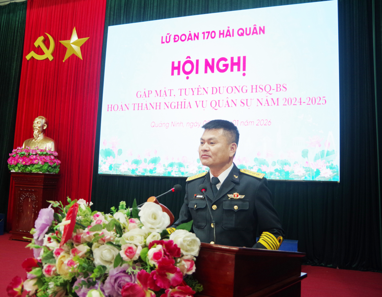 HQ Online - Sáng 8/1, tại phường Hà Tu, tỉnh Quảng Ninh, Lữ đoàn 170, Vùng 1 Hải quân tổ chức Hội nghị gặp mặt, tuyên dương hạ sĩ quan - binh sĩ hoàn thành nghĩa vụ quân sự năm 2025. Thượng tá Đỗ Xuân Chung, Lữ đoàn trưởng và Đại tá Nguyễn Đình Mạnh, Chính ủy Lữ đoàn chủ trì hội nghị.