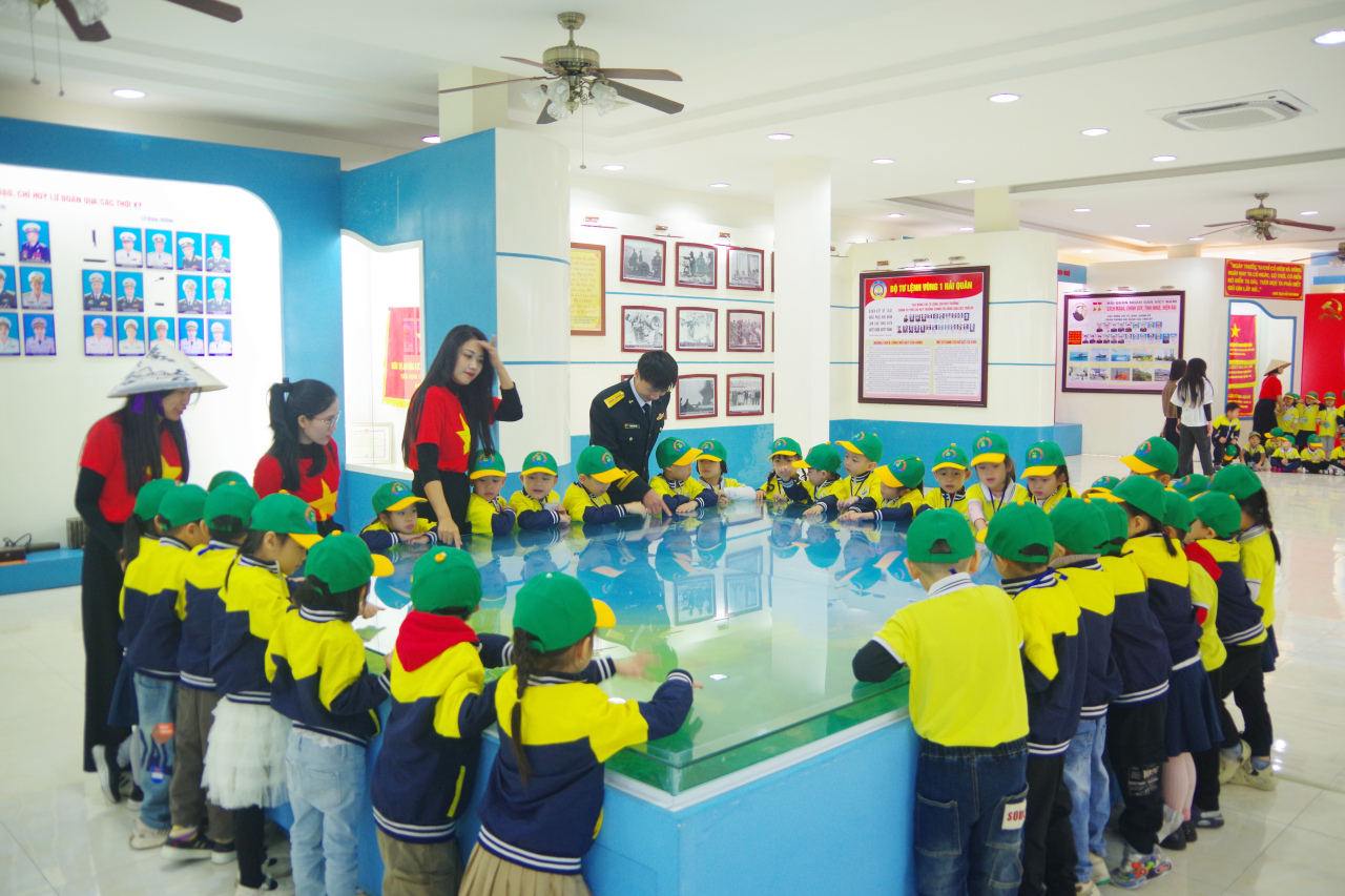 Các cháu học sinh tham quan nhà truyền thống đơn vị